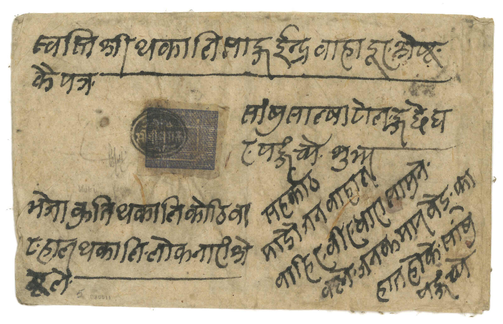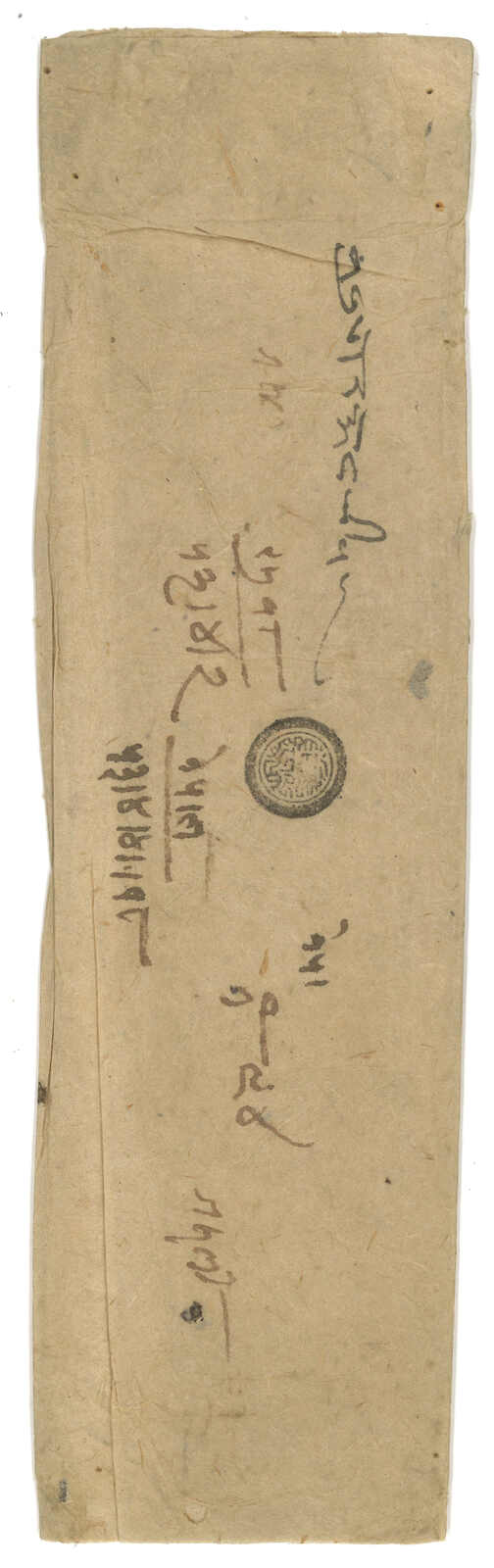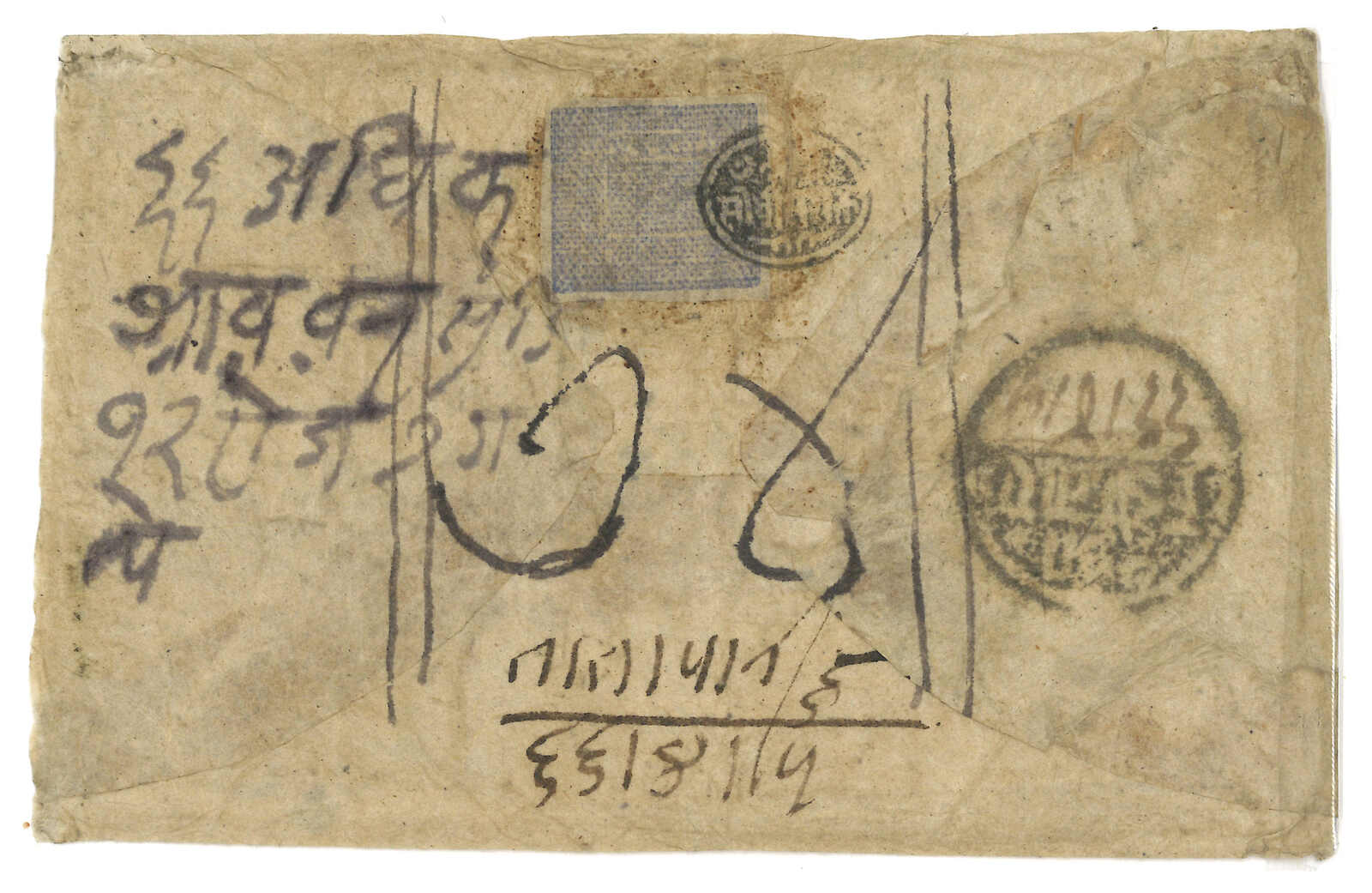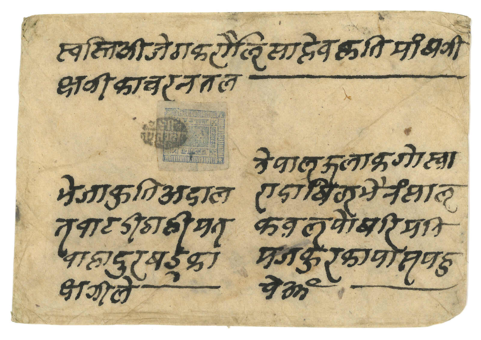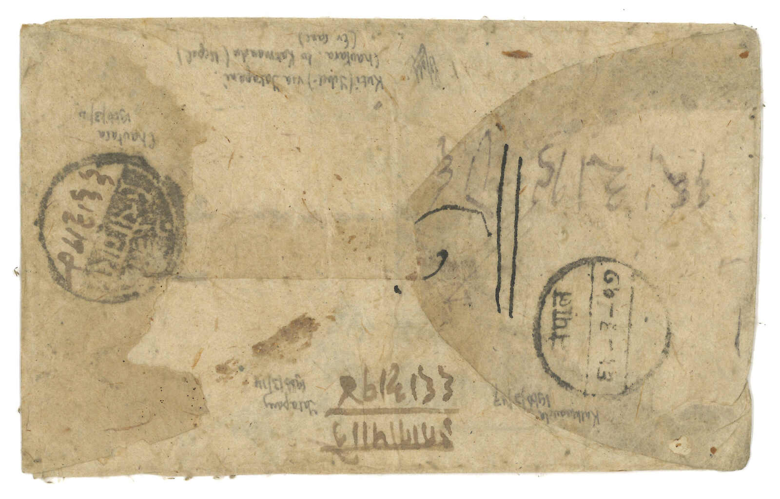 ca 1900 Nepalesae Court cover from Kuti, f.w. Sripech and Crossed Khukris 1a, tied by Kuti postmaster seal. Transit Tatapani and Chautara. Stamped covers from Kuti are already very scarce, not to mention cancelling the stamp by