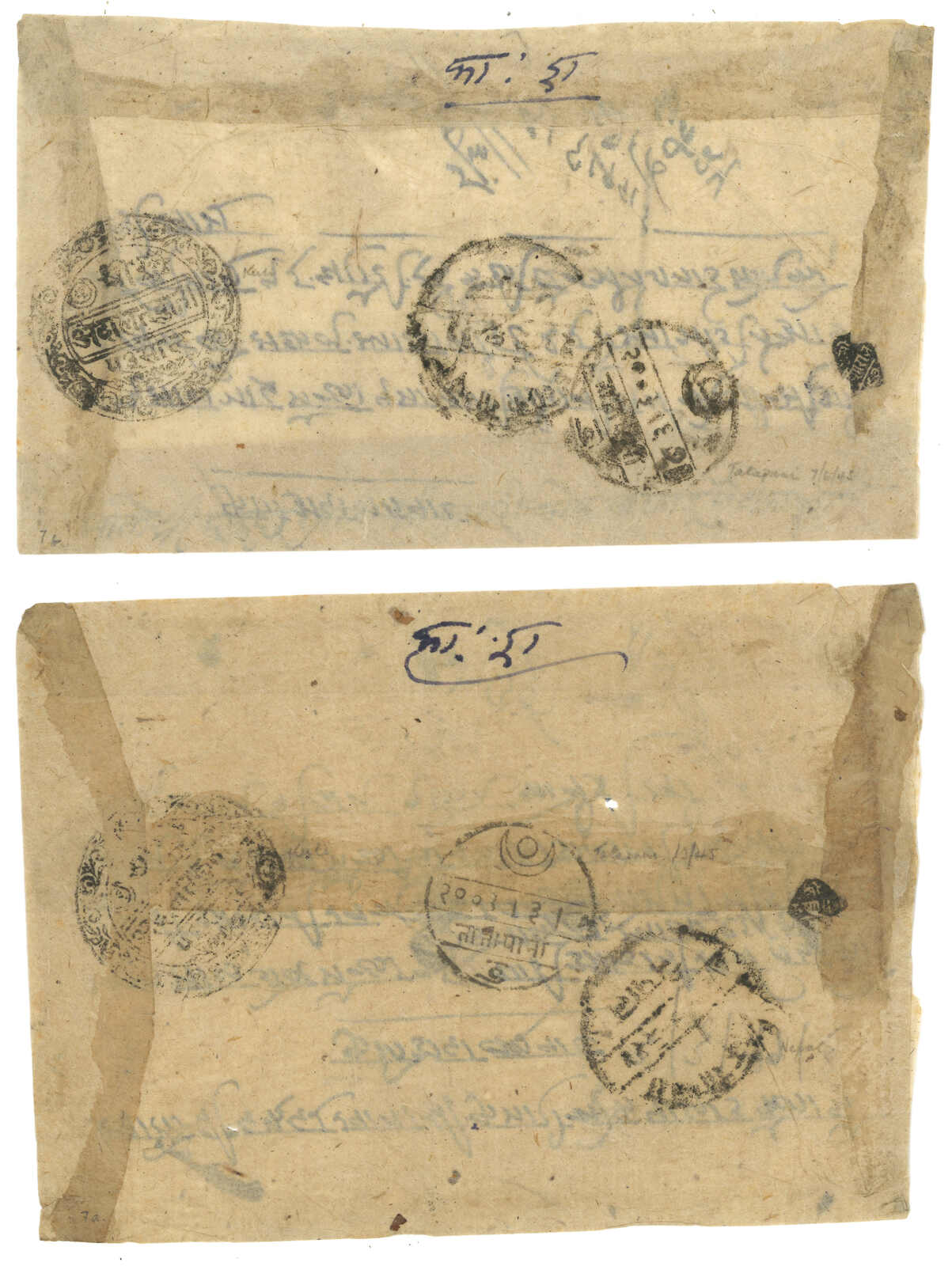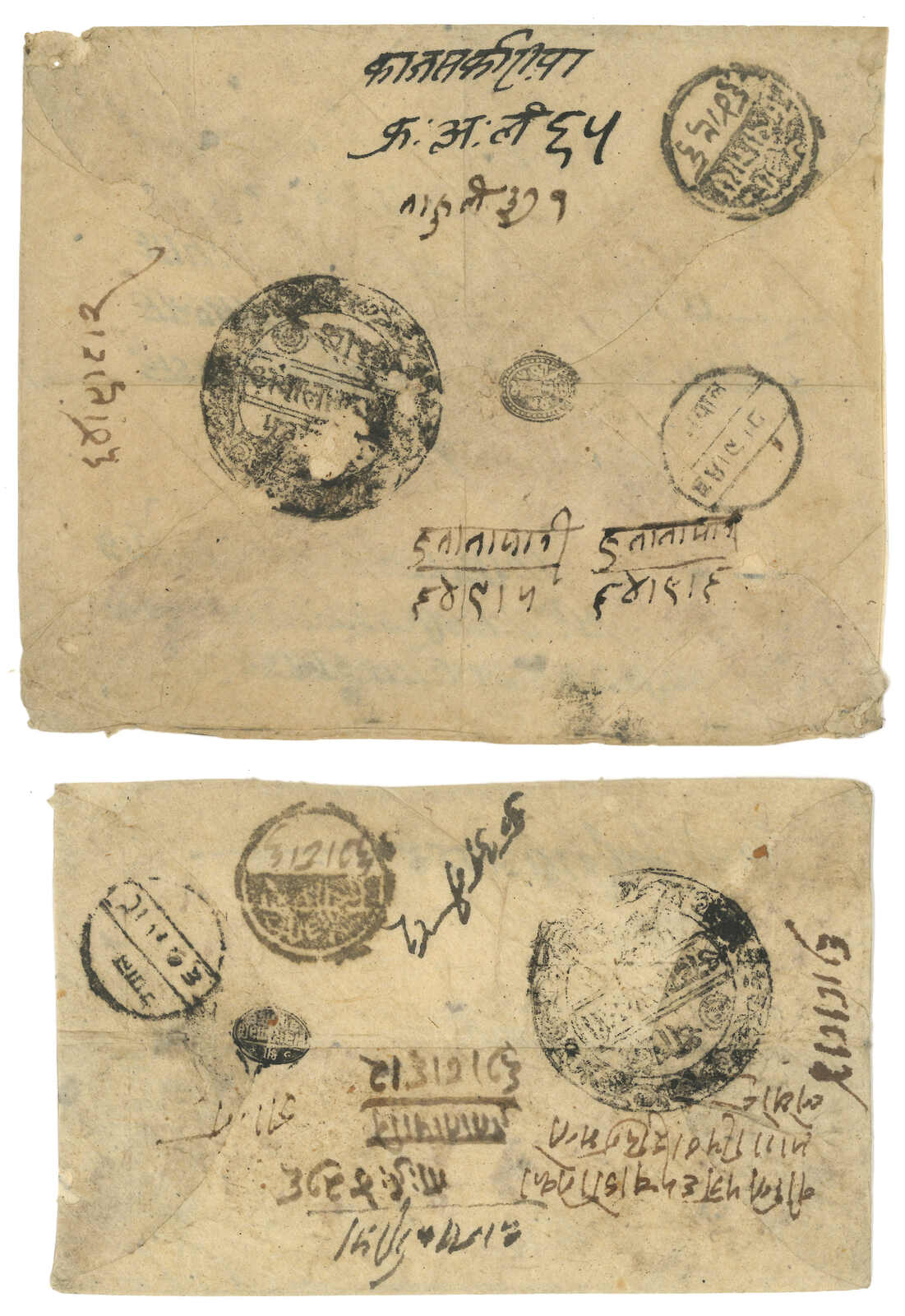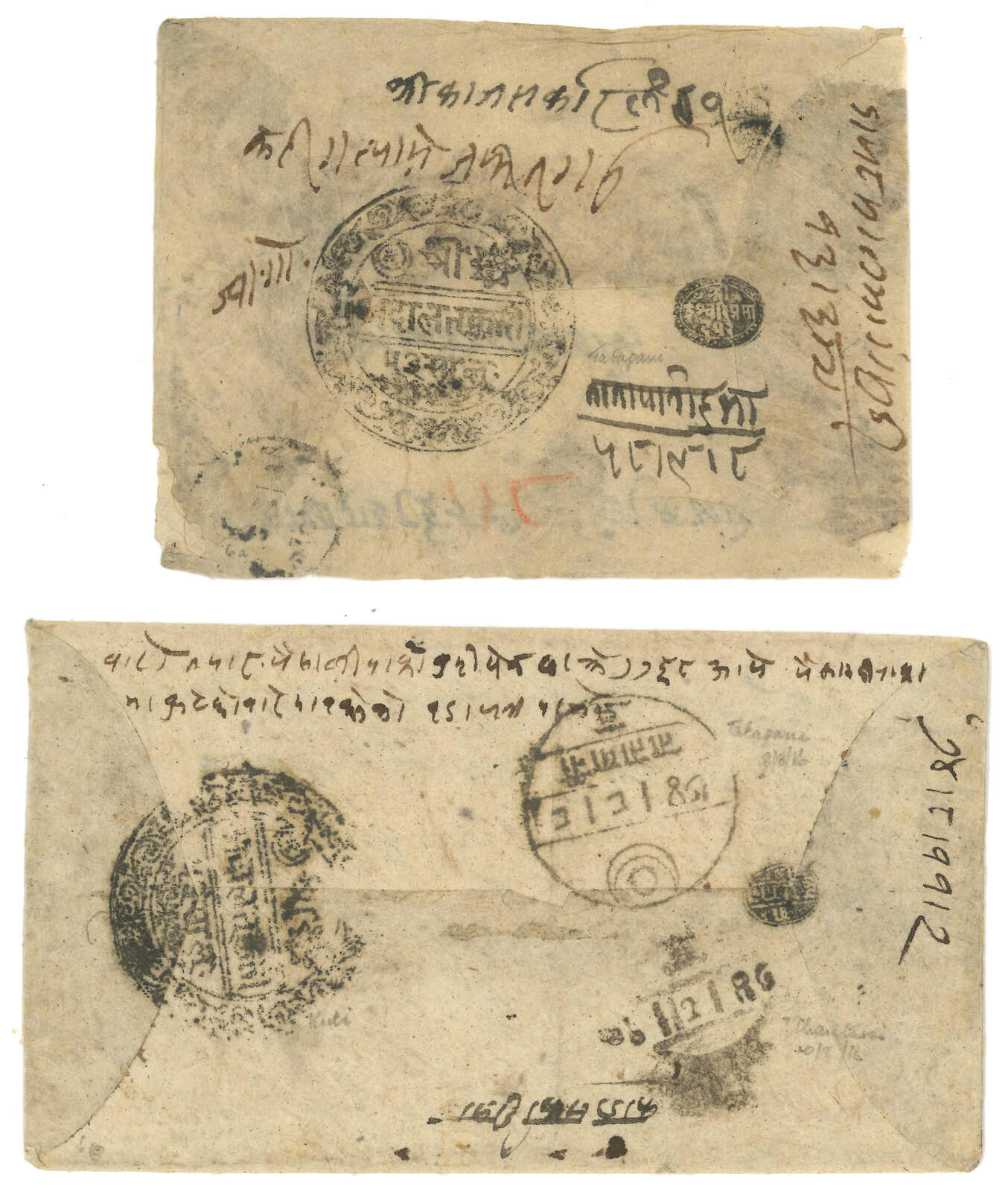 A pair of Nepal stampless covers from Kuti to Kathmandu. One with Kuti court seal, alongside with Tatapani and Chautara transit cds. One without court seal but with Tatapani transit cds. A good pair for comparison.