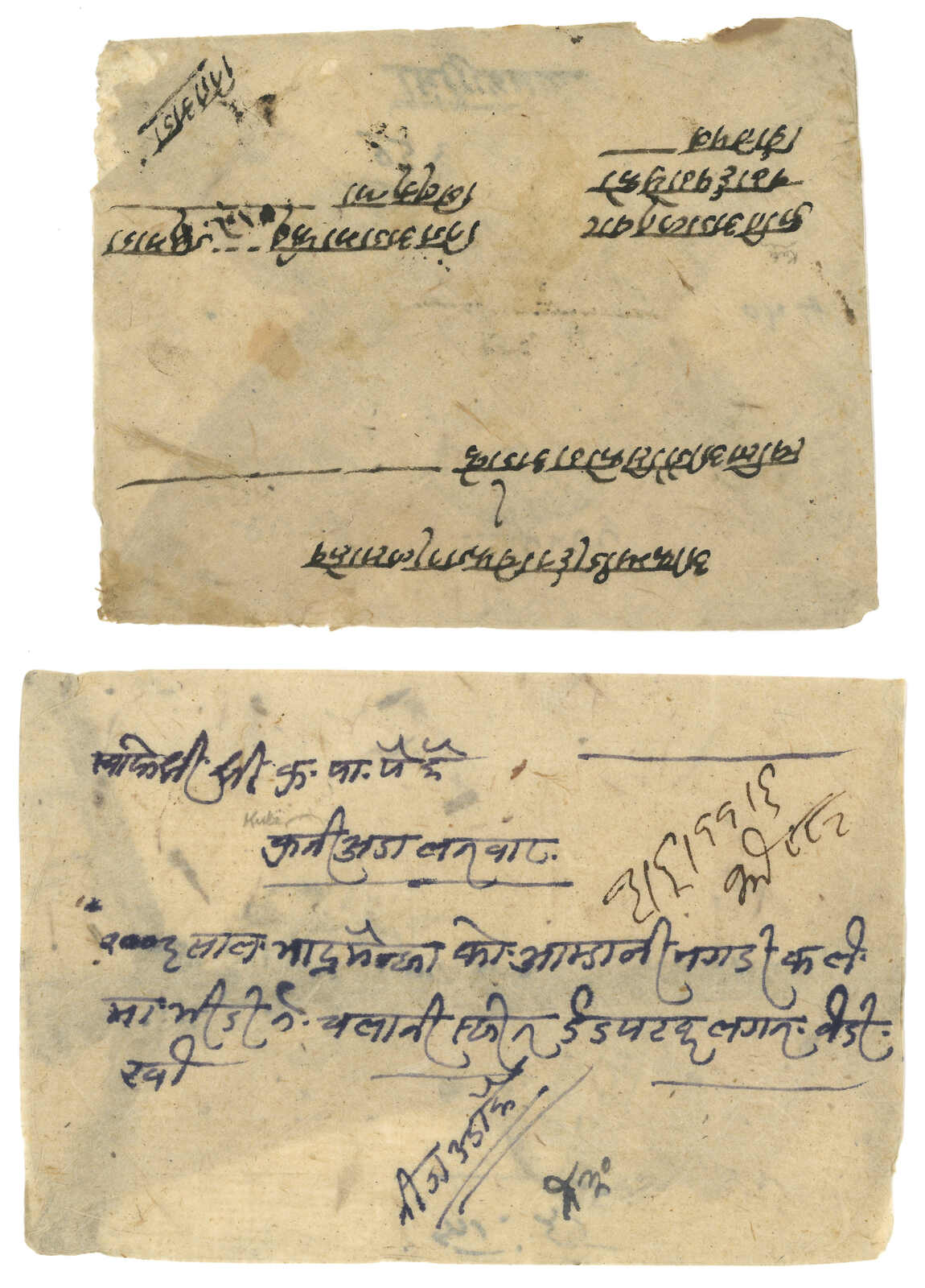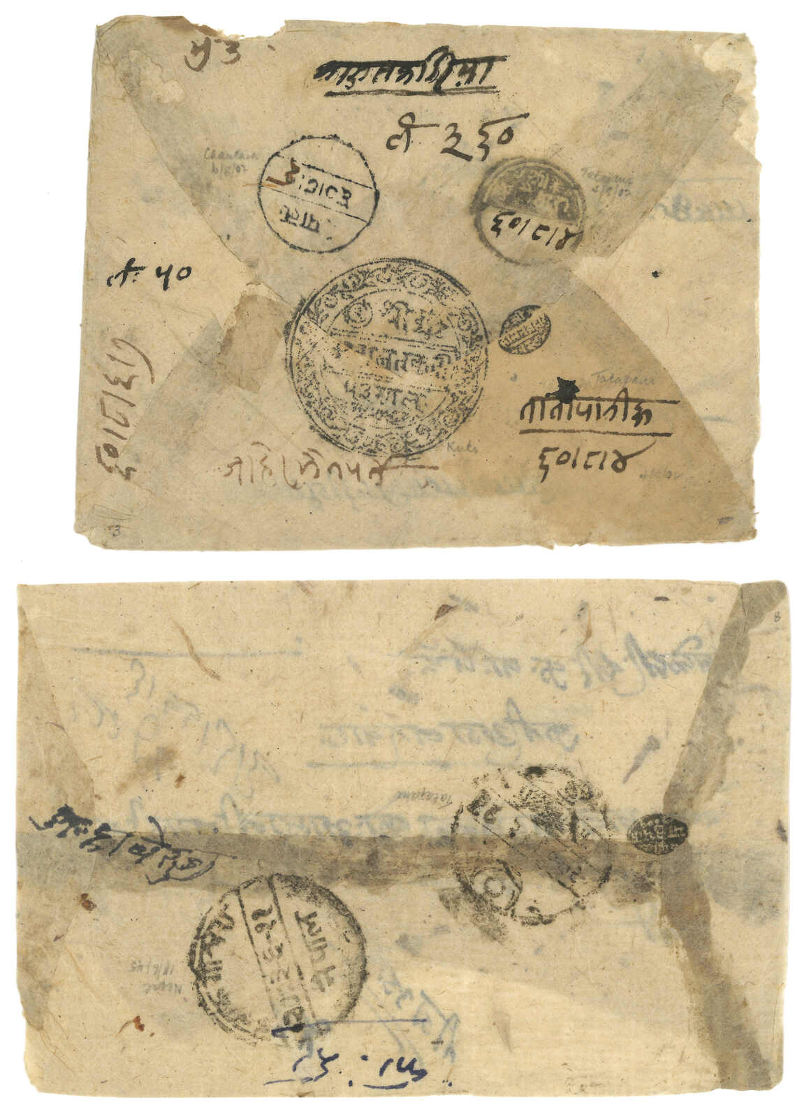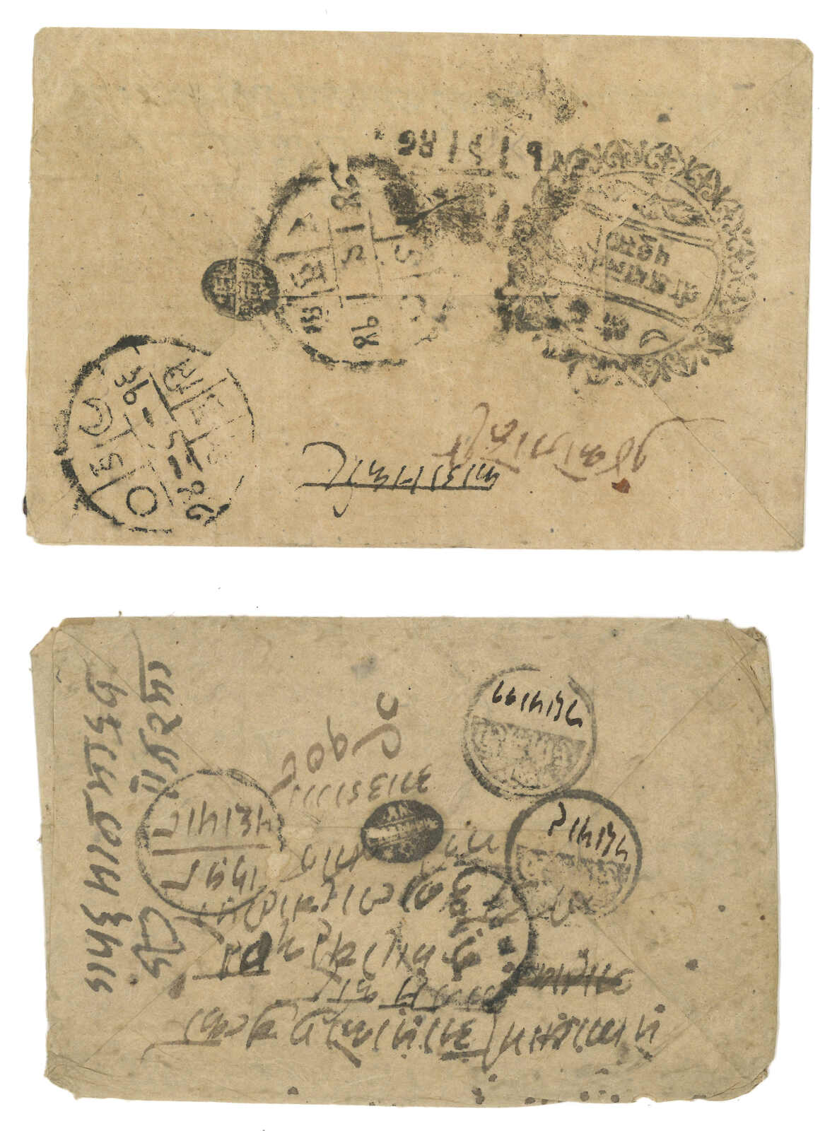 A pair of Nepal stampless covers from Kuti to Kathmandu. One with Kuti court seal, alongside with Tatapani and Chautara transit cds. One without court seal but with Tatapani transit cds. A good pair for comparison.