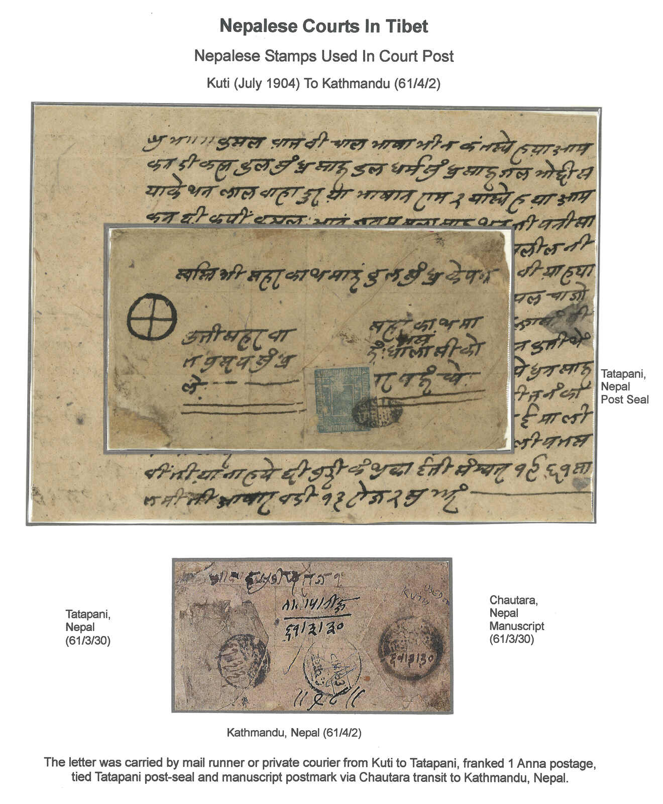 約1900年尼泊爾法庭封,自聶拉木寄出,貼皇冠與雙刀1a,銷聶拉木郵局局長戳記。經Tatapani及 Chautara。出自聶拉木之貼票信封本已少見,以聶拉木郵局局長戳蓋銷者更可遇不可求。(Image 1)