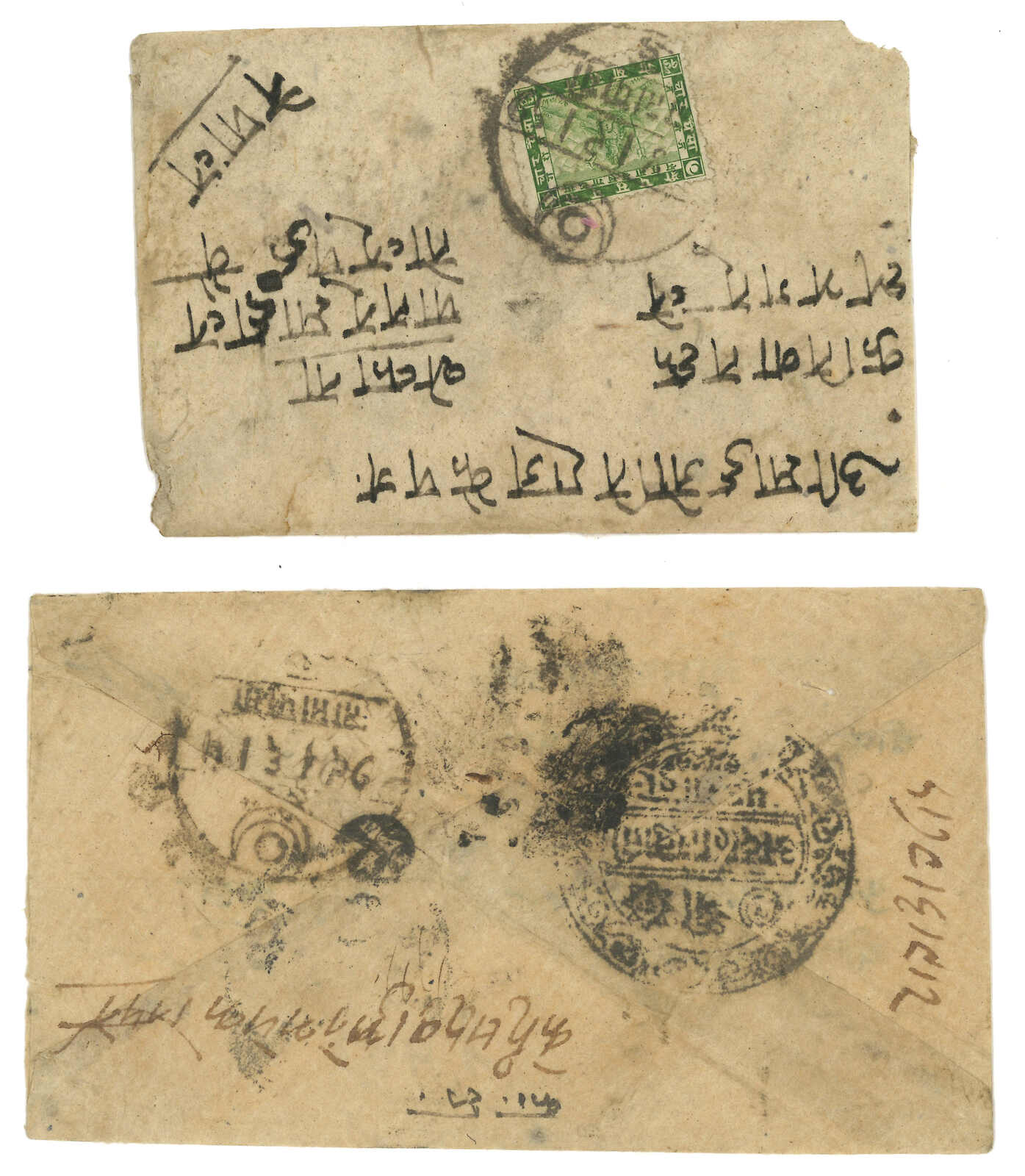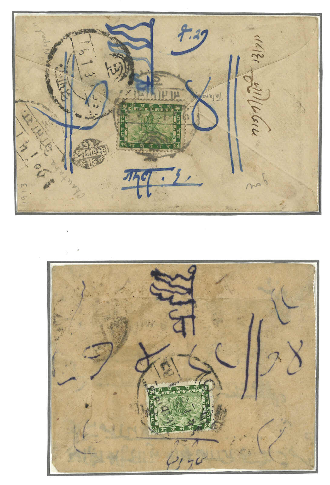 ca 1910s a pair of covers from Kuti to Kathmandu. One court official cover with court seal, Tatapani and Chautara transit. One f.w. Siva Mehadeva 4p. A good pair for comparison.