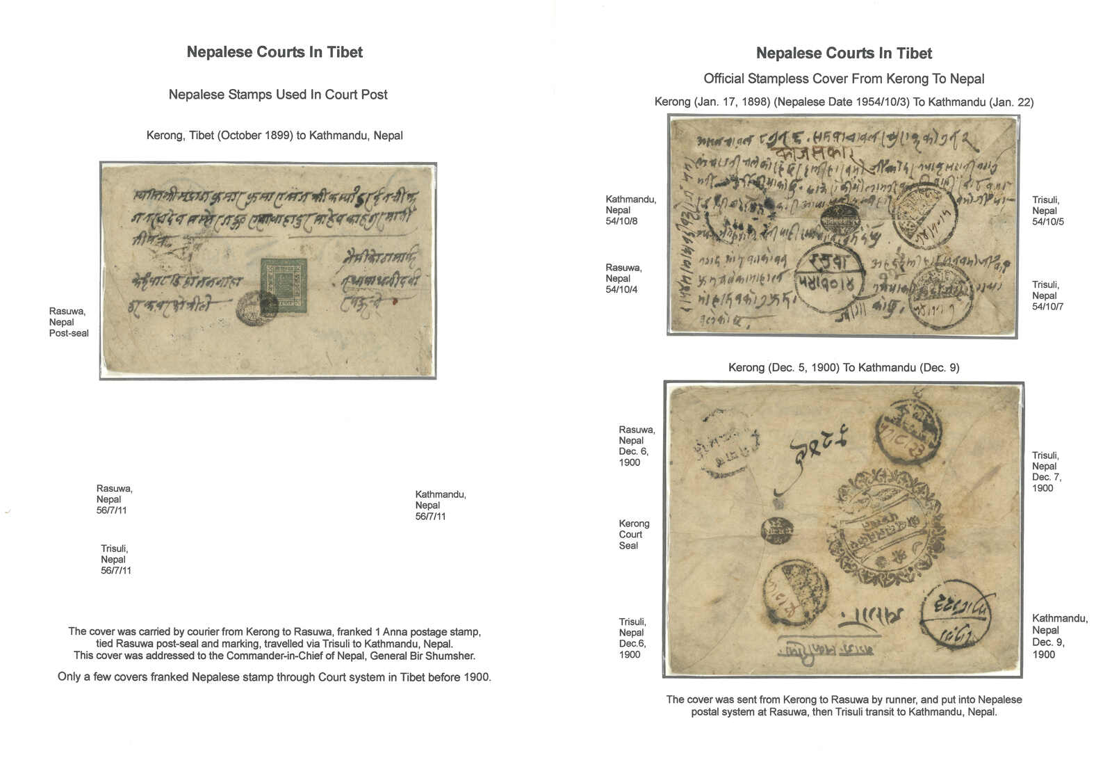 1898 and 1900 a pair of Kerong court covers to Kathmandu, aplied with court seal, Rasuwa and Trisuli transit cds. Arrived Kathmandu.