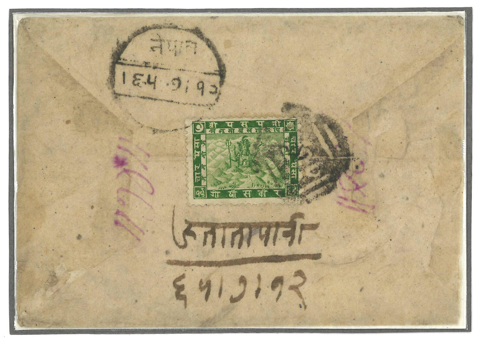 1908 (26 Sep) Kuti court cover to Nepal, f.w. Nepalese Siva Mehadeva 4p, tied by Tatapani postmaster seal with manuscript. Arrived Kathmandu (27 Sep). One of the a few covers f.w. 1907 issue and tied by seal.