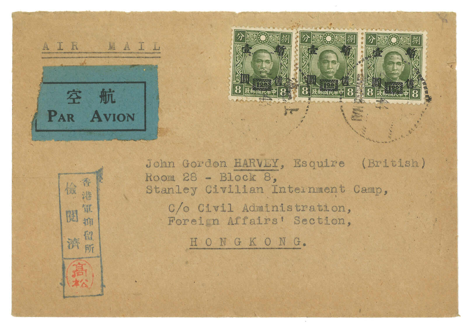 1944 Shanghai to Stanley Civilian Internment Camp, Hong Kong , f.w. SYS surch "Temporarily Sold" $1/8c x3, tied by Shanghai bilingual cds. Transit Canton (7 Feb). On front with type JH3 "Hong Kong Military Internment Camp