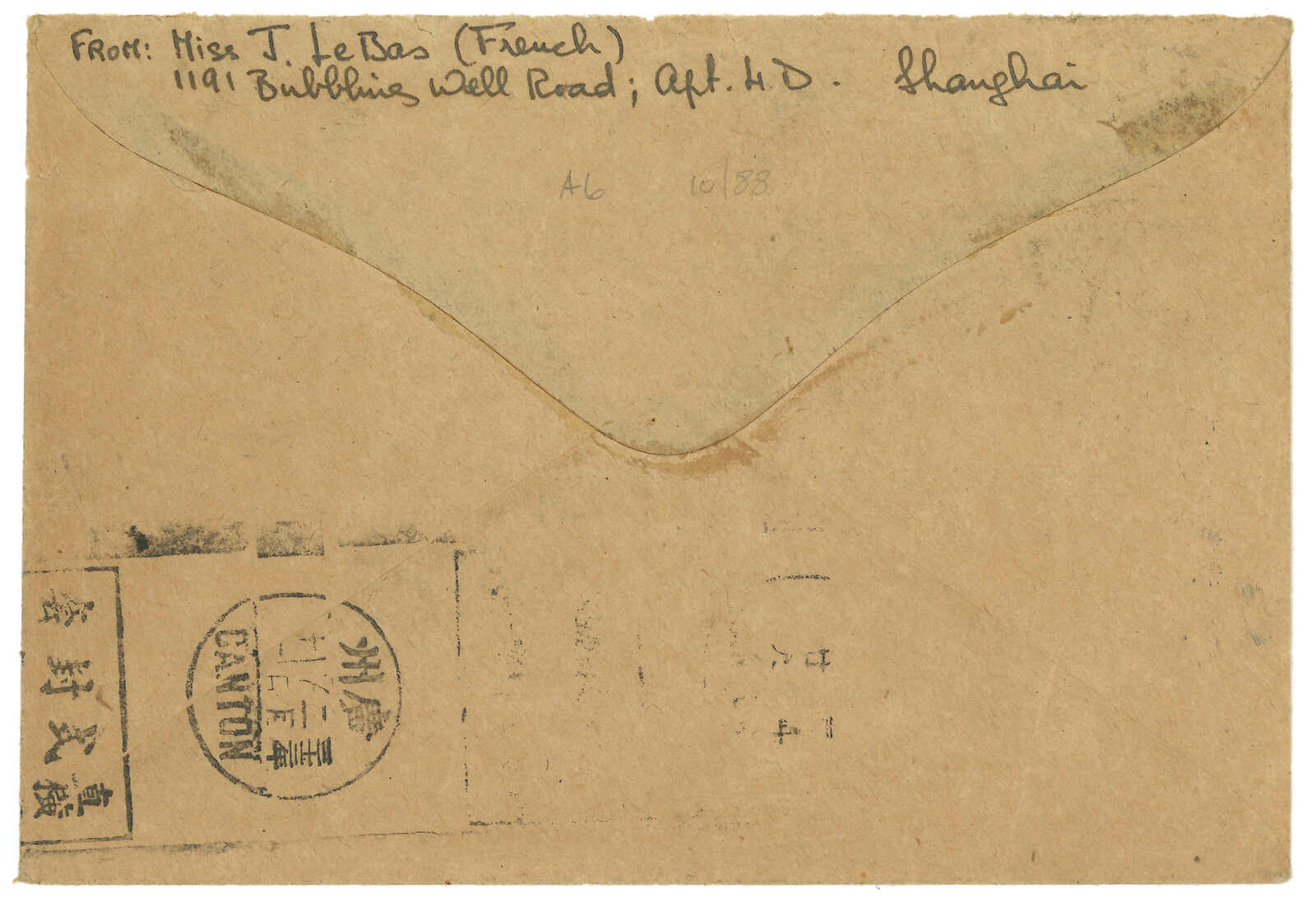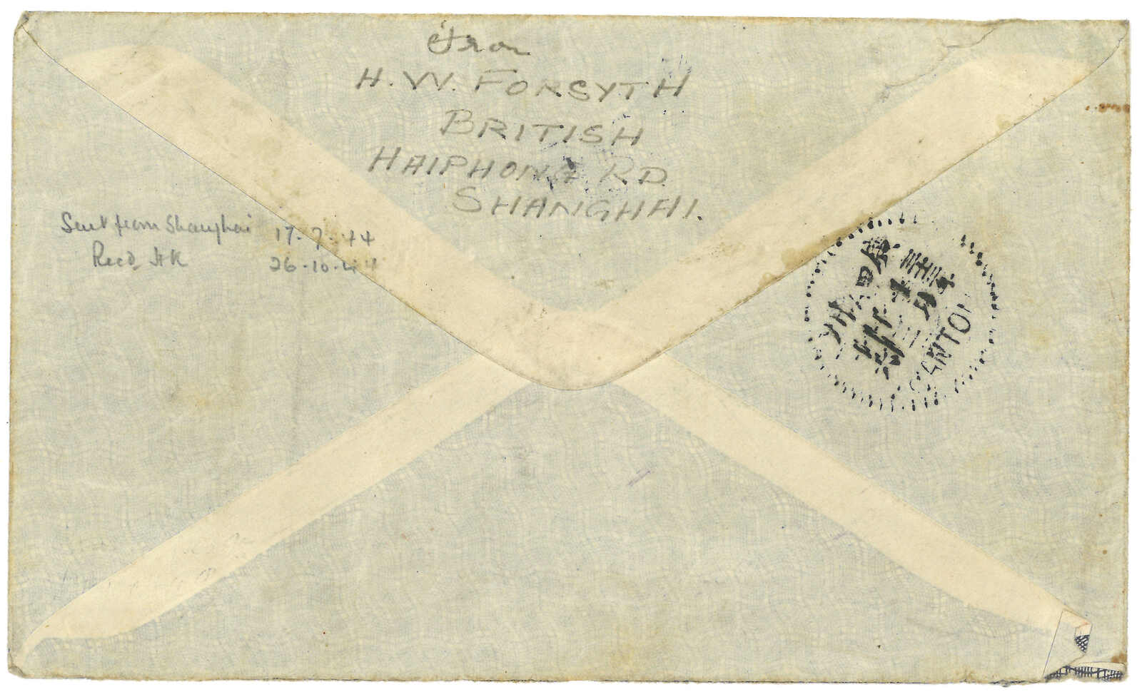 1944 Shanghai to Stanley Camp, Hong Kong, frankless. Transit Canton (13 Oct) with pro-Japanese “Oppose American bomber attacking hospitals and schools at Canton / People should stand firm and oppose” slogan on front. Showing