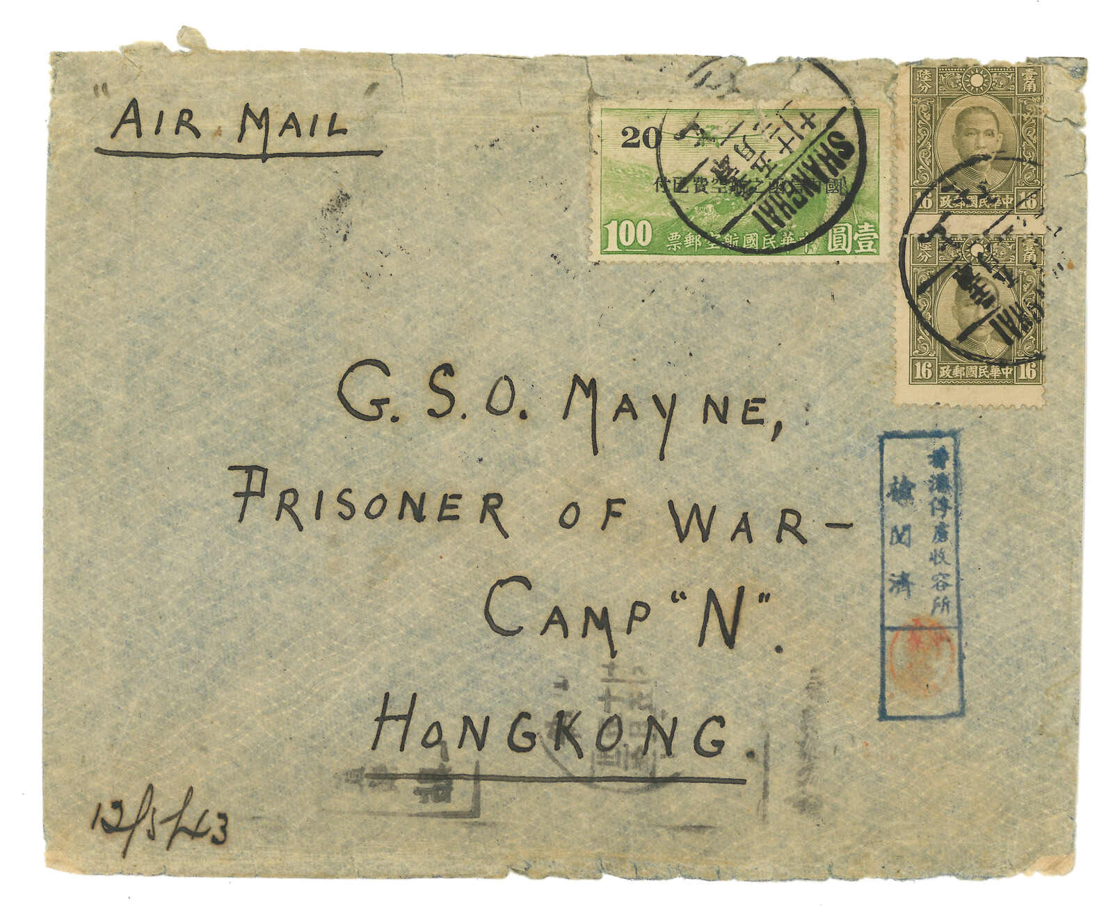 1943 Shanghai (13 May) to Camp N (Argle Street Officiers Camp), Hong Kong, f.w. SYS 16c in pair + airmail stamp surch Japanese currency 20s, tied by Shanghai bilingual cds. Transit Canton (15 May). Applied with "Hong Kong POW