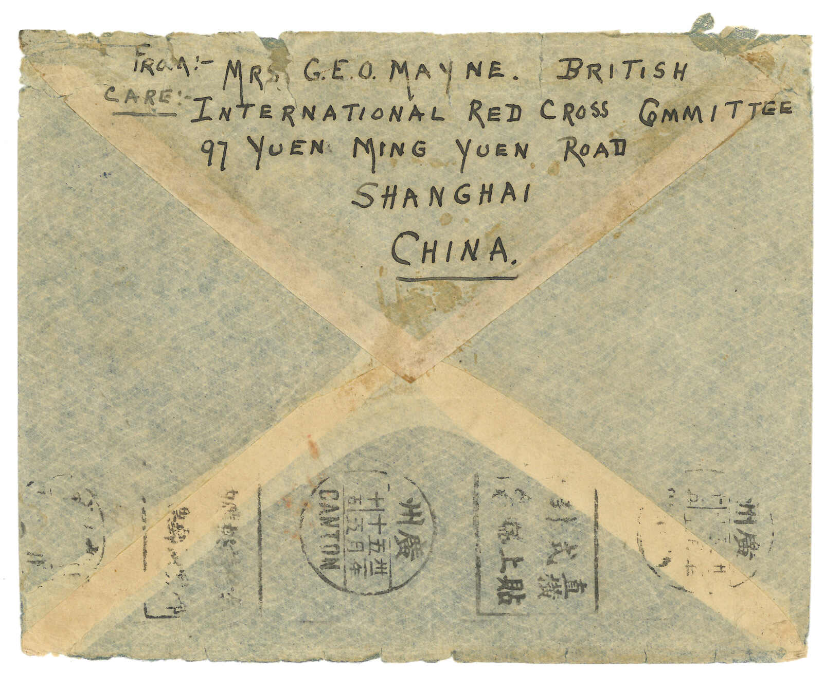 and “DETAINED IN HONGKONGBY JAPANESE FROM DECEMBER 1941 TO SEPTEMBER 1945” cachet. The aircrafts of CNAC were attacked by the Japanese during the Battle of Hong Kong. Late usage of this detained mail cachet.