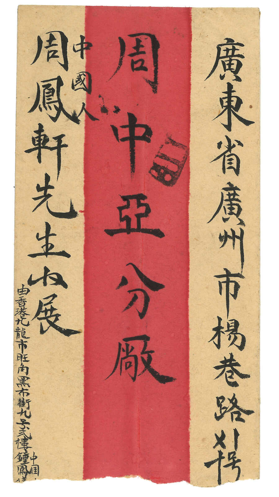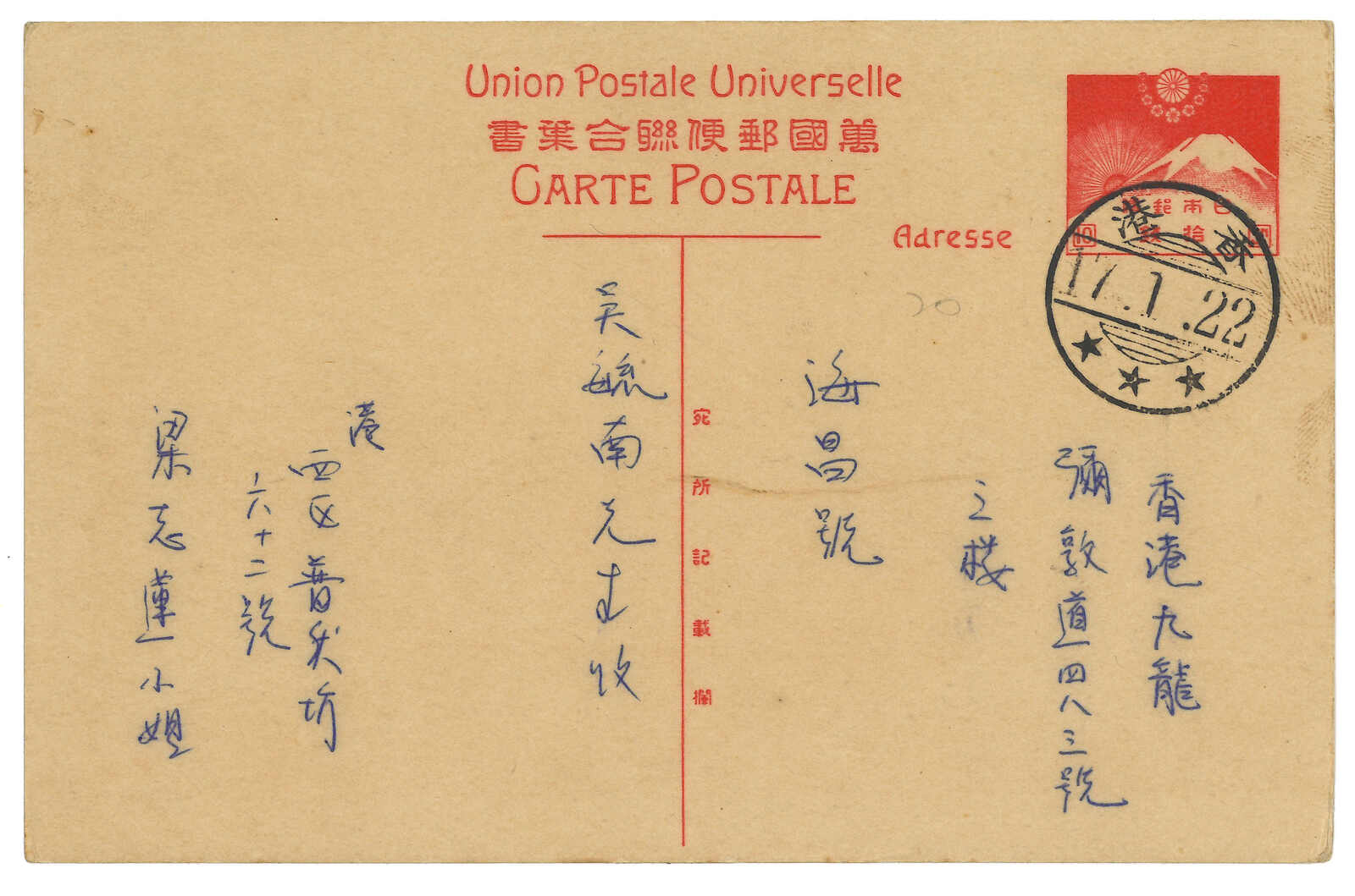 1943.3.18 油麻地寄廣州。紅條封,貼日本票5錢,合本地信函郵資,銷模糊但可辨之油麻地日式日戳。3.17抵廣州。雖然油麻地等分局已於2月14日重開,但並無郵戳可供使用,故此為極早之油麻地日戳實寄例子,比H da Luz所記錄之6月9日更早。出自日佔時期各分局之H da