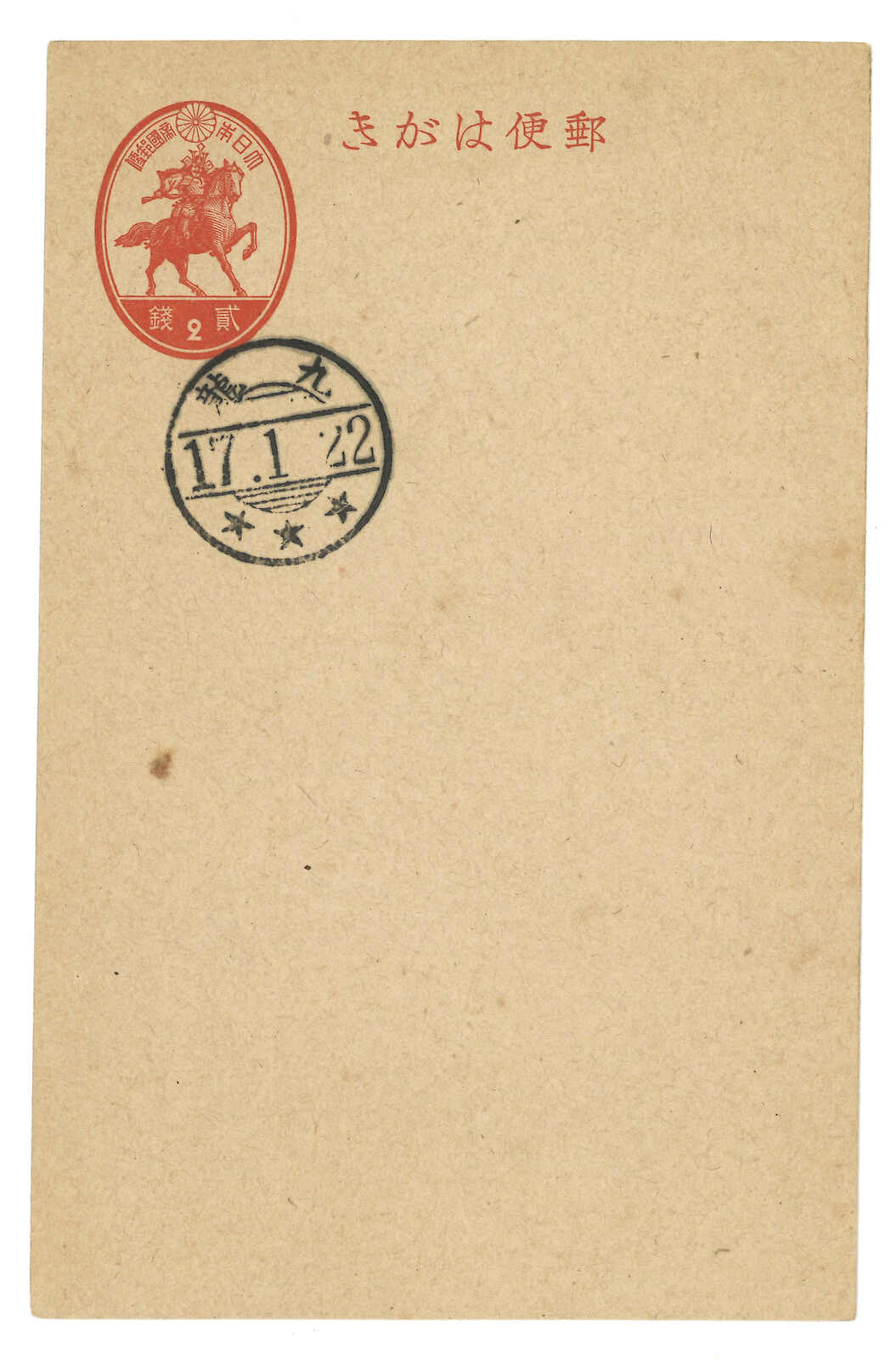 香港郵局在日本佔領下開業首日2錢郵資片(楊目JPC1),銷九龍日式戳。首日郵資片更顯少見。(Image 1)