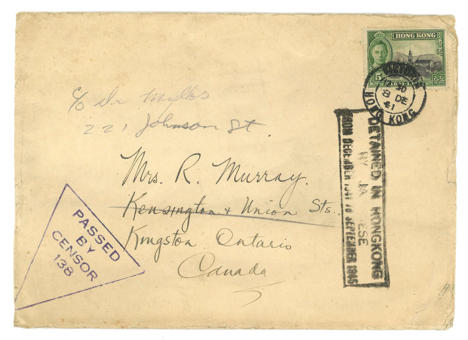 1941 Hong Kong (8 Dec) to Canada, detained in Hong Kong, f.w. Centenary of British Occupation 5c, tied by Victoria cds, alongside with “PASSED BY CENSOR 138” triangular mark and “DETAINED IN HONGKONGBY JAPANESE FROM DECEMBER