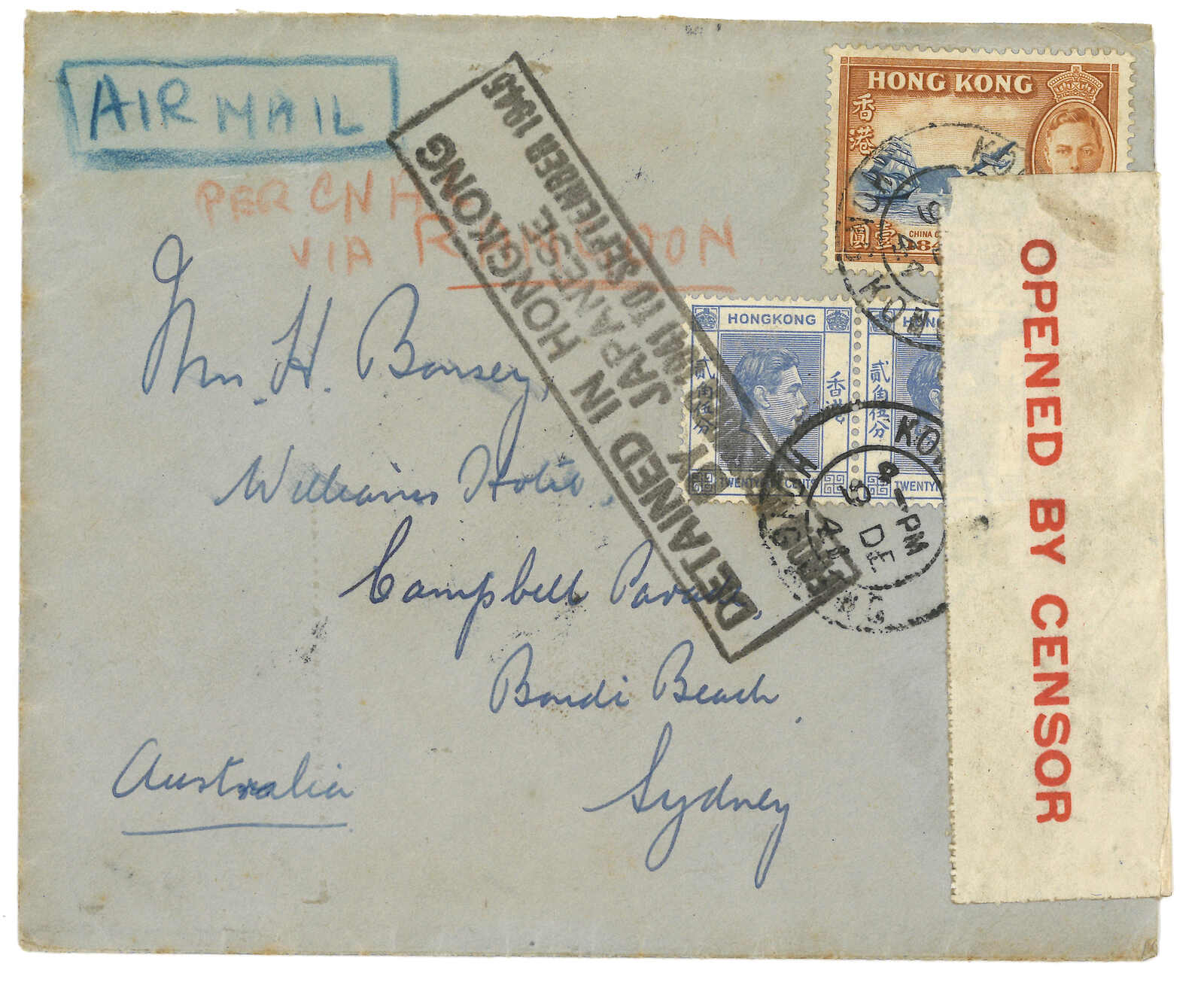 香港寄澳大利亞,被扣留在港,貼開埠百週年1元 + 香港佐治六世2角5分雙連,銷九龍日戳。檢查並重封。寫有“Per CNAC Via Rangoon”批示,鈐“DETAINED IN HONGKONGBY JAPANESE FROM DECEMBER 1941 TO SEPTEMBER 1945”戳記。日軍於1941年12月8日進攻香港。中航公司的飛機多數被炸毀。此為甚晚之扣留郵件例子。(Image 1)