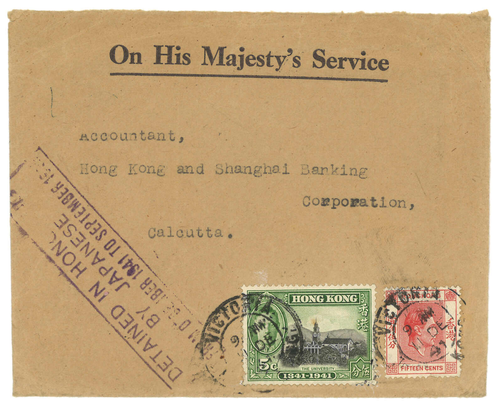 1941 (11 Dec) OHMS cover from Hong Kong to HSBC, Calcutta, detained in Hong Kong, f.w. Centenary of British Occupation 5c + Hong Kong KGVI 15c, tied by Victoria Hong Kong cds, alongside with “DETAINED IN HONGKONGBY JAPANESE