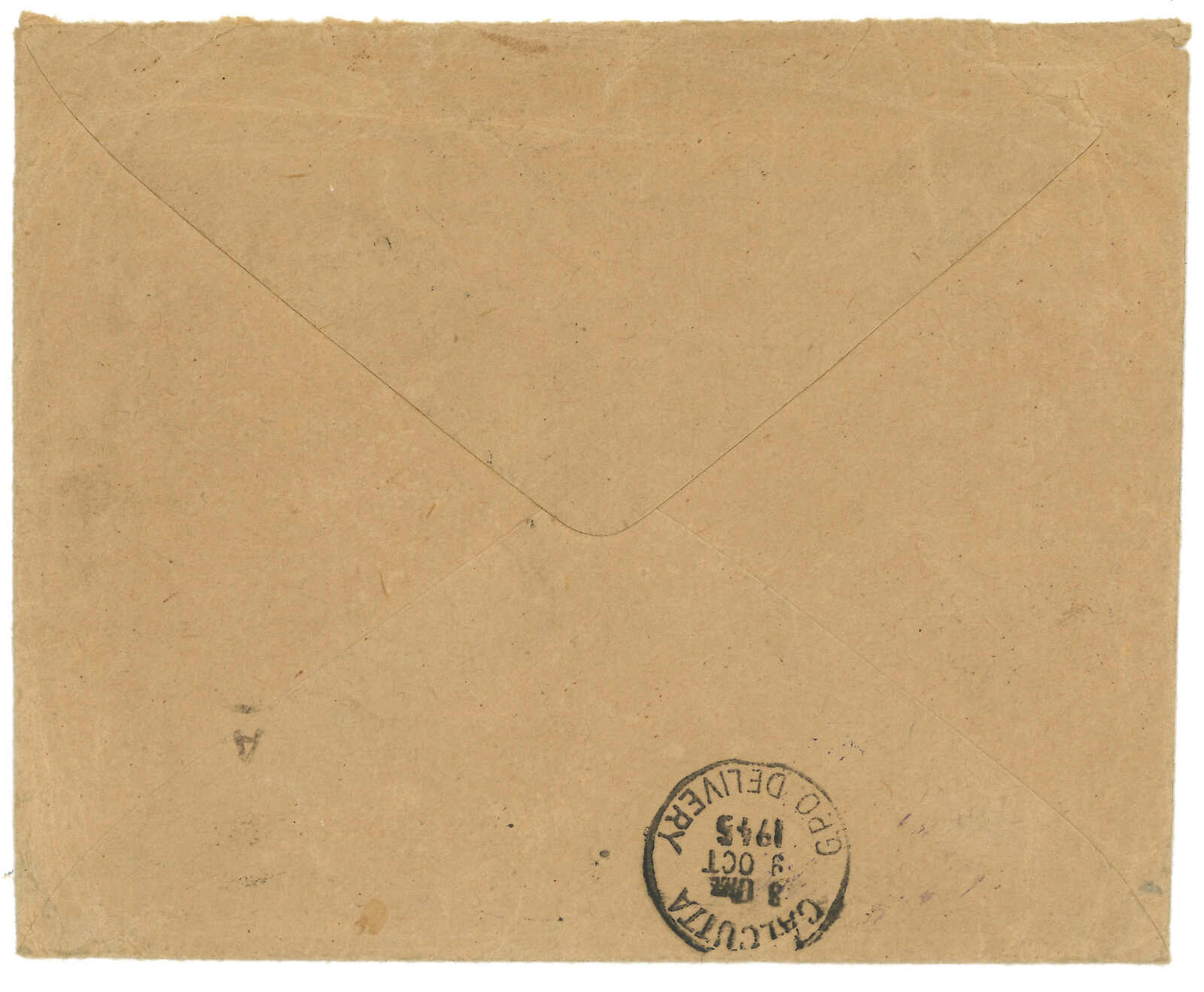 FROM DECEMBER 1941 TO SEPTEMBER 1945” cachet in violet. Released after WWII and arrived Calcutta (9 Oct 1945). Very late examples of detained mail which was once thought to be the latest date for this type of mails. Applied with arrival cds which