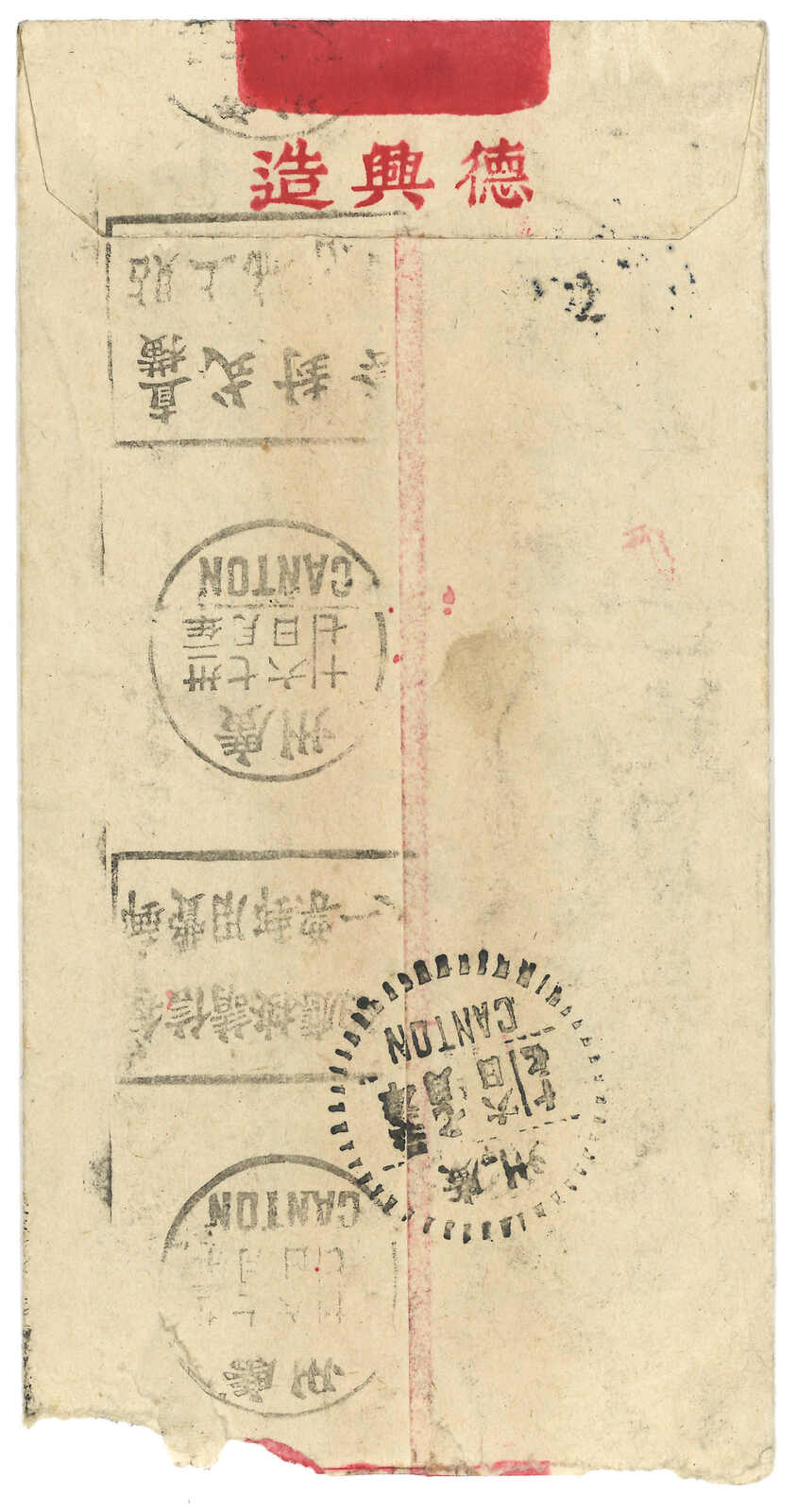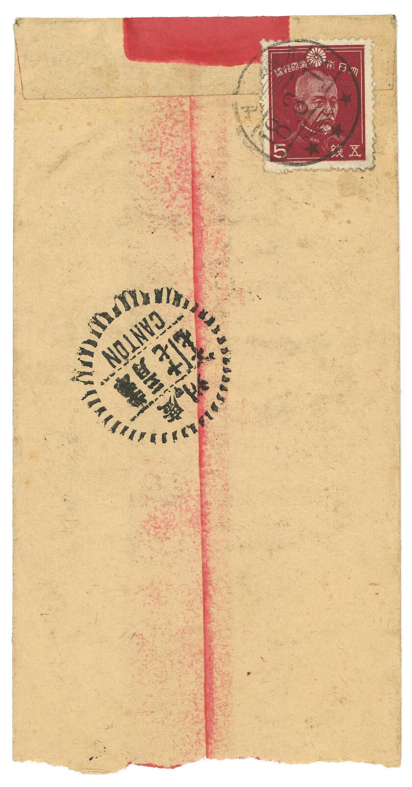 1943 Hong Kong (28 Jun) to Canton. Red band cover, f.w. Japanese issue 5s, tied by Kowloon Sham Shui Po Japanese style cds. Arrived Canton (6 Jul). Despite the rather omnipresent examples from H da Luz covers, commerically