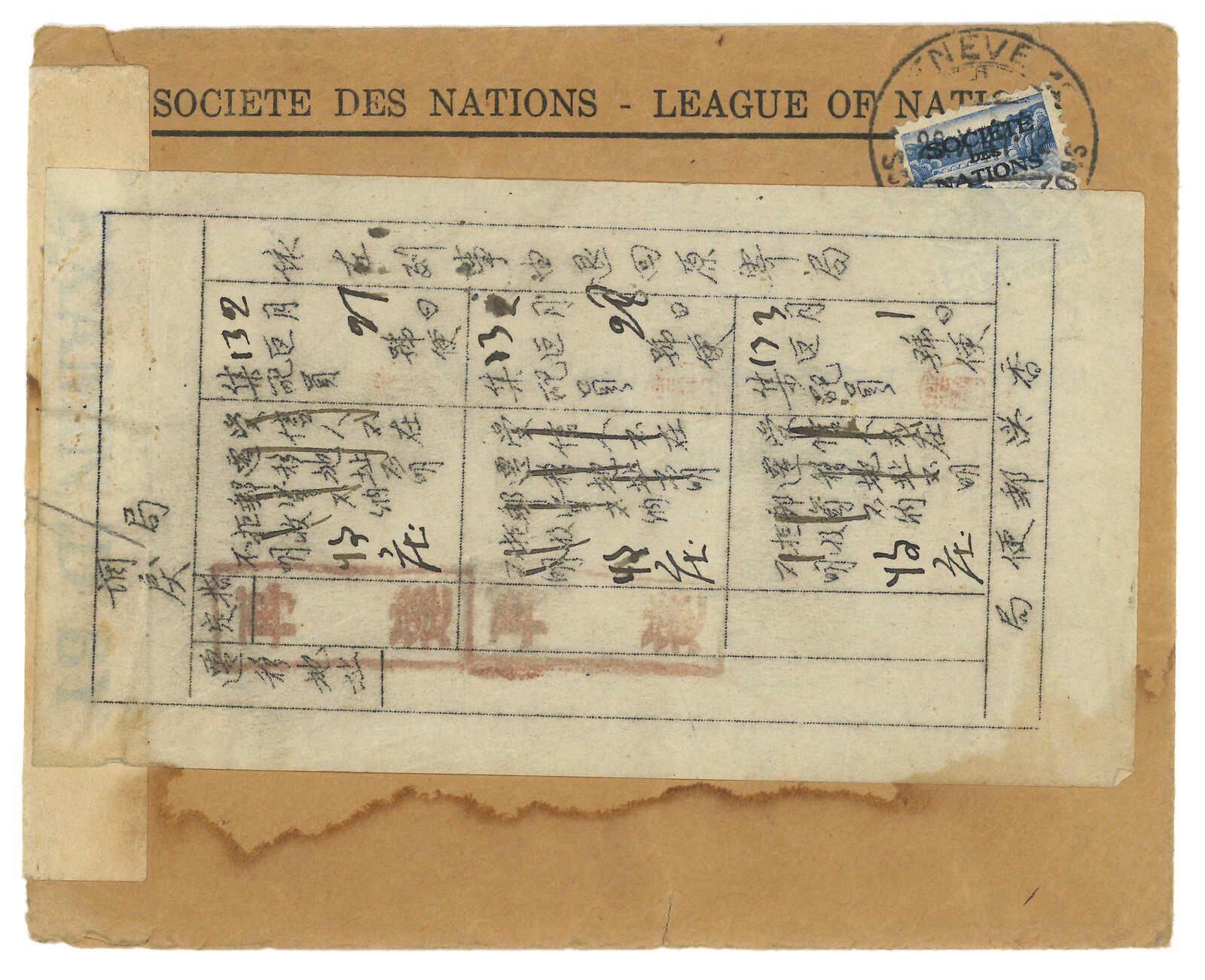 1941.10.29 國際聯盟寄香港輔政司署,貼國聯加蓋票30分,銷日內瓦日戳。由日本遞信省檢查重封。貼有日文便條一張,顯示曾多次送遞但失敗。帶水漬。極具歷史意義。(Image 1)