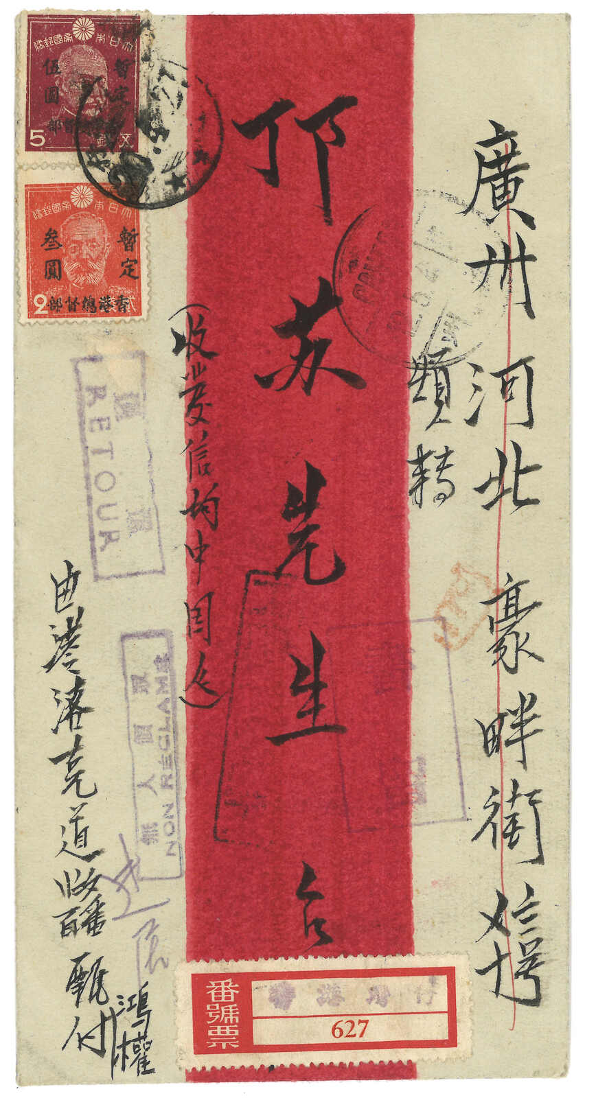 1943.6.28 香港寄廣州。紅條封,貼日本票5錢,銷九龍深水埗日式日戳。7.6抵廣州。出自日佔時期各分局之H da Luz集郵封雖然頗為常見,但實寄者有如鳳毛麟角。深水埗之存世例子僅約三四件,極為稀罕。(Image 1)