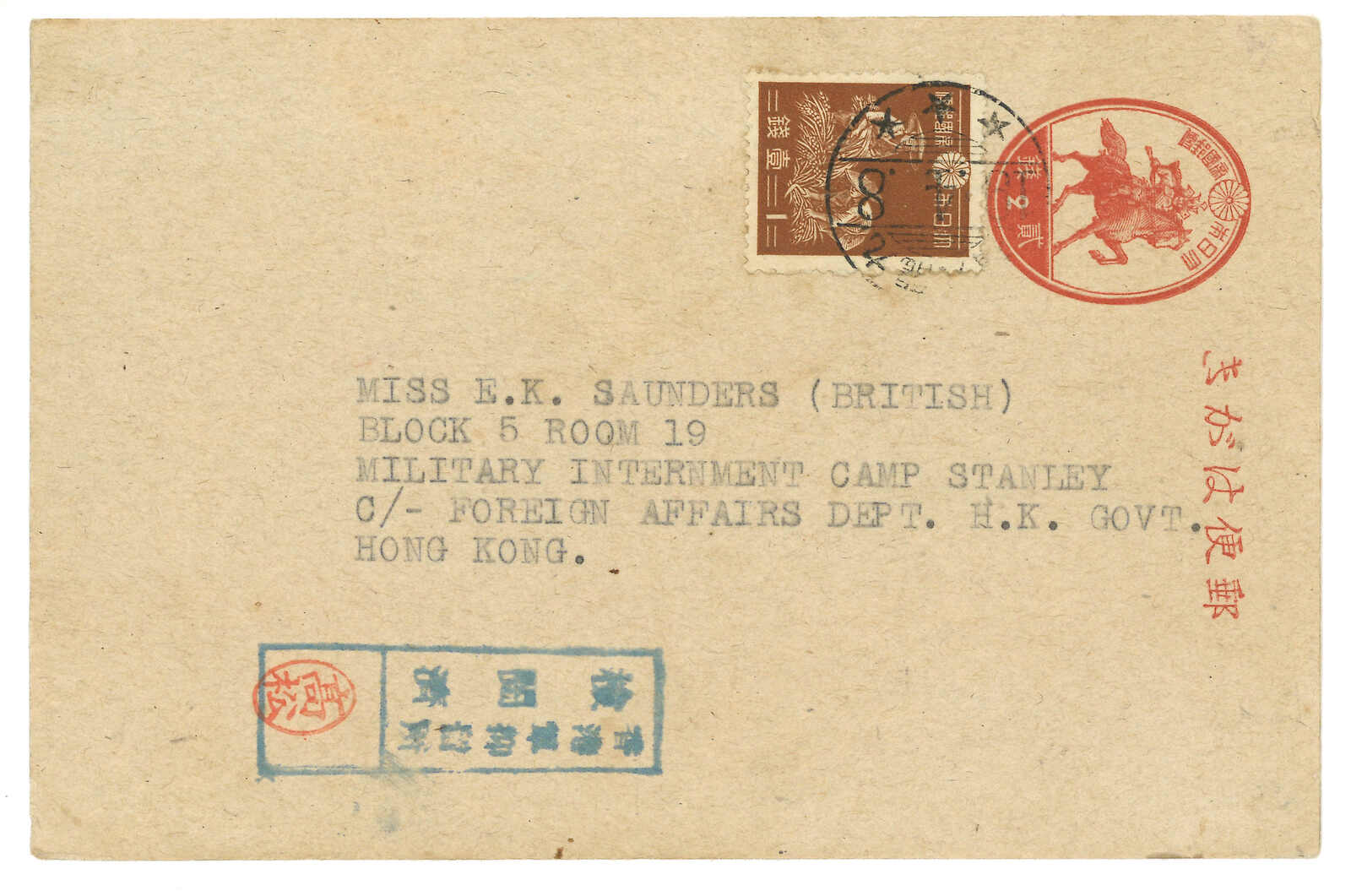 1944.12.11 日本2錢郵資片(楊目JPC1)自九龍寄赤柱拘留營,加貼1錢,合本地明信片郵資3錢,銷九龍油麻地日式日戳,旁鈐“香港軍抑留所”檢查章及檢查員河內之名字章。陳卓堅舊藏。(Image 1)