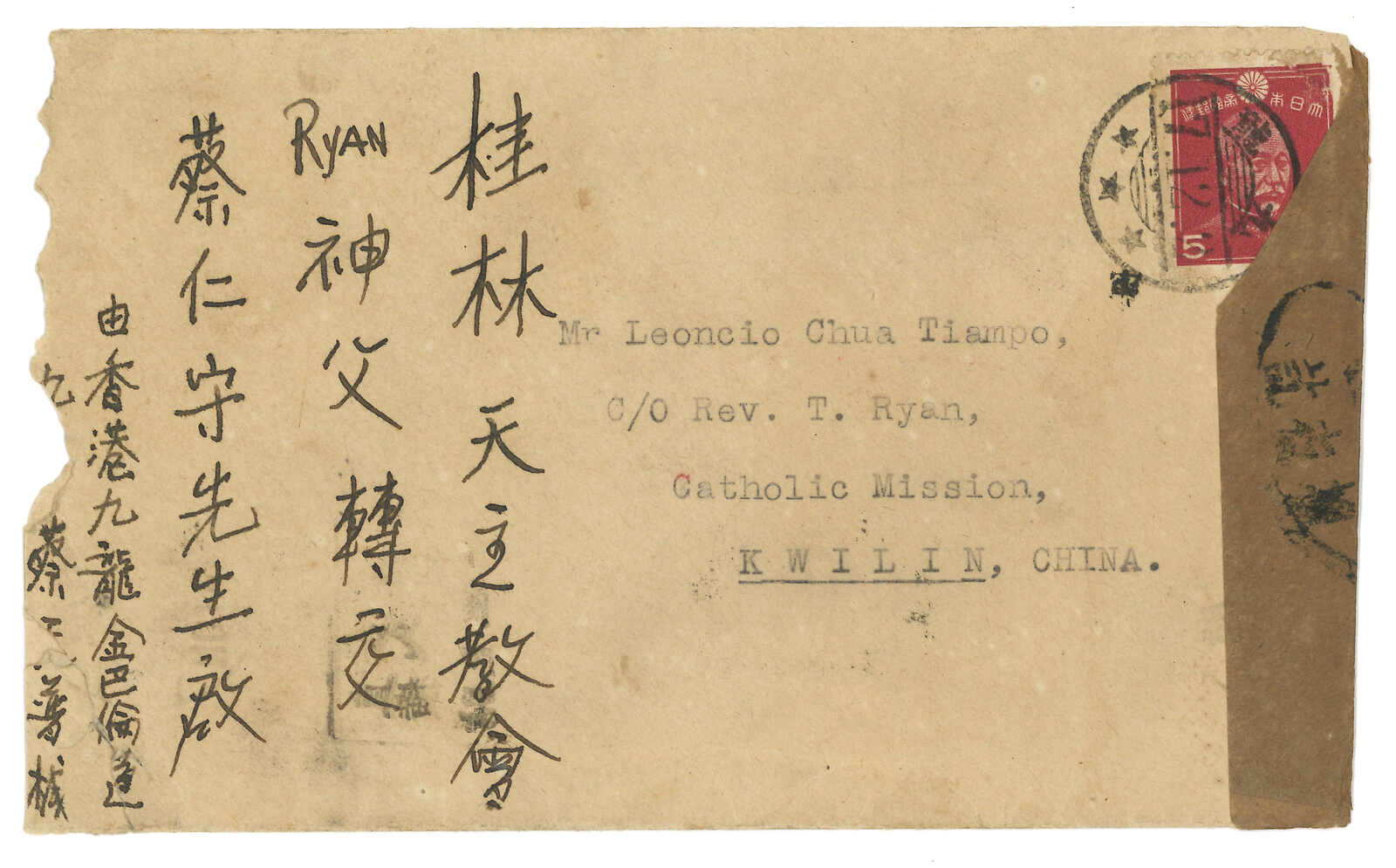 1942 Kowloon (2 Dec) to Kweilin, f.w. Japanese issue 5s, tied by Kowloon Japanese style cds. Transit Canton. Censored and resealed with oval Chinese censor mark. Cover roughly opened at left. Japanese issues was not obliterated