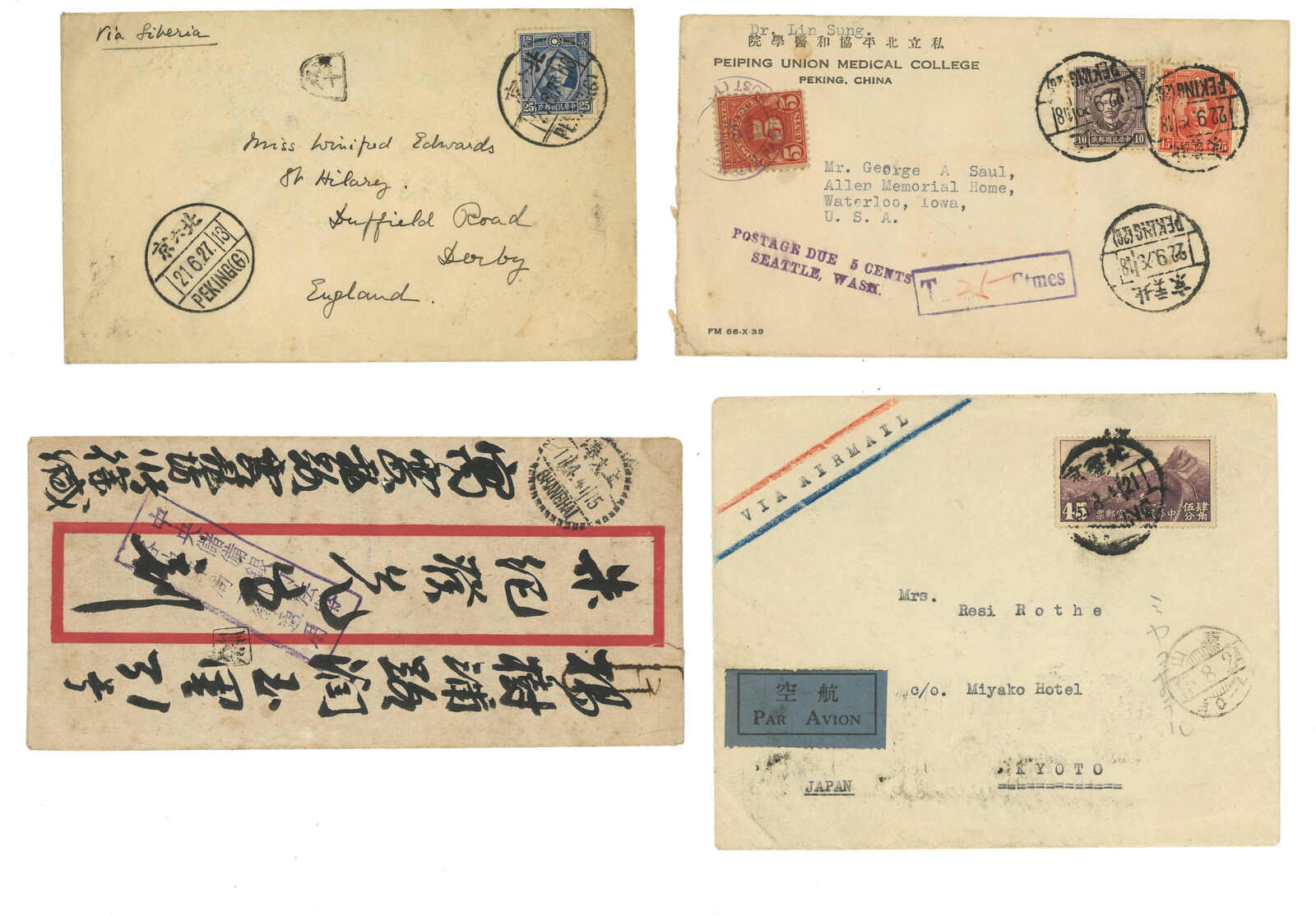 1937年北平淪陷,翌年改名北京。至1941年一組6件日佔北京初期之實寄封片,其中3件寄國内、3件寄國外,一件欠資,均貼用無加蓋票,反映了日佔早期之郵政史。(Image 1) (Image 2) (Image 3) (Image 4) (Image 5) (Image 6) (Image 7) (Image 8)