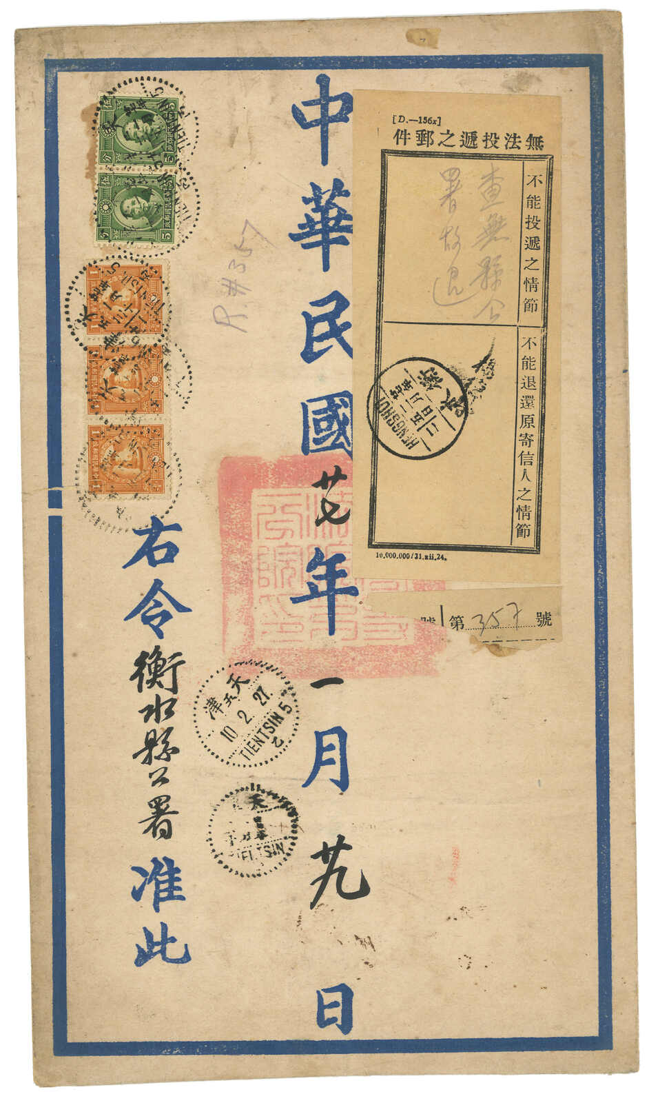 2324 image1938. Official registered mail of Tientsin High Court of the puppet government, sent 30 Jan to Hengshui Government. However Hengshui was controlled by communist and rejected the Court Order. The post office then annotated “County Government does not exist” on 5 Feb and returned the Order. Returned to Tientsin 9/10 Feb.
