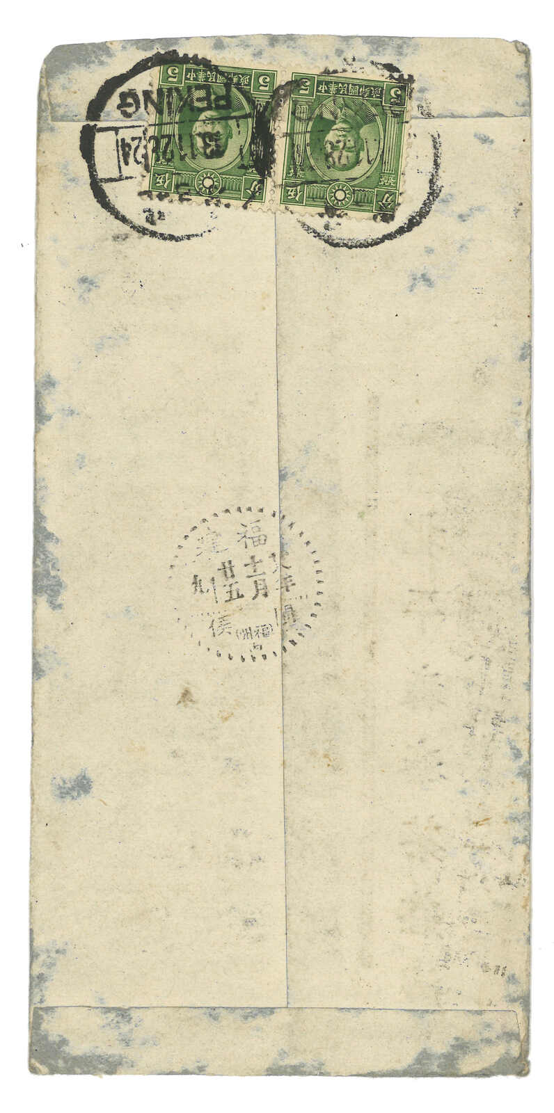 2499 image1944 Kanlanhu (24 Nov) to Meihsien. Chinese style cover, f.w. SYS ovpt. For Use in Kwangtung x30, in total of Japanese military curreny $2 = Central Reserve Bank $6 domestic rate in Wang Jingwei regime, tied by Kwangtung Kanlanhu cds. Transit via secret route at Sheungping (29 Nov). Arrived Meihsien (20 Feb). Transit time for nearly 3 months. Applied with “ROC censor” mark. Very scarce commerical usage of Chunghwa Print DIe III 8c origina stamp ovpt. For Use in Kwangtung (Chan JK26), not to mention multuple franking. Since the fall of Kwantung, three secret routes (East, South and West) were set up. Sheungping was the east route but was blocked frequently.