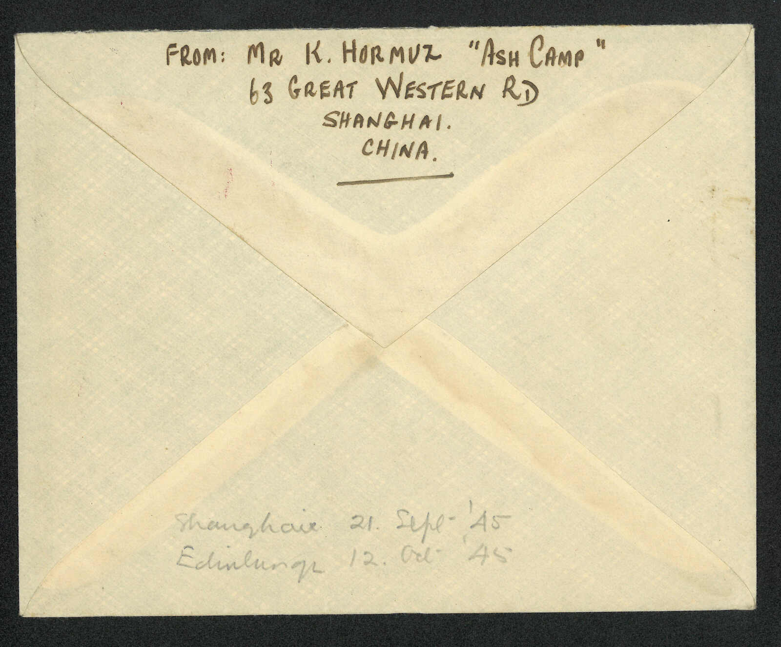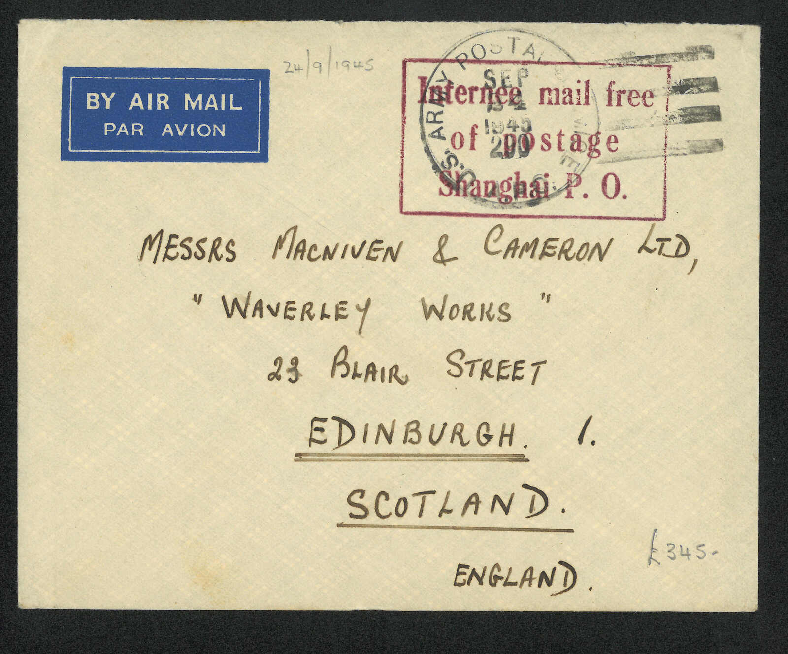 2492 image1945 Ash Camp, Shanghai (24 Sep) to Scotland, bearing US Army Postal Service APO cdsand framed “Internee mail free of postage / Shanghai PO” cachet. WWII was over by the time of this mail.