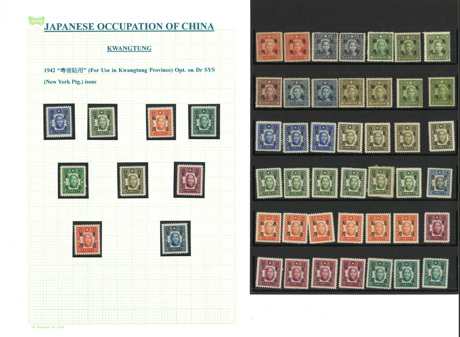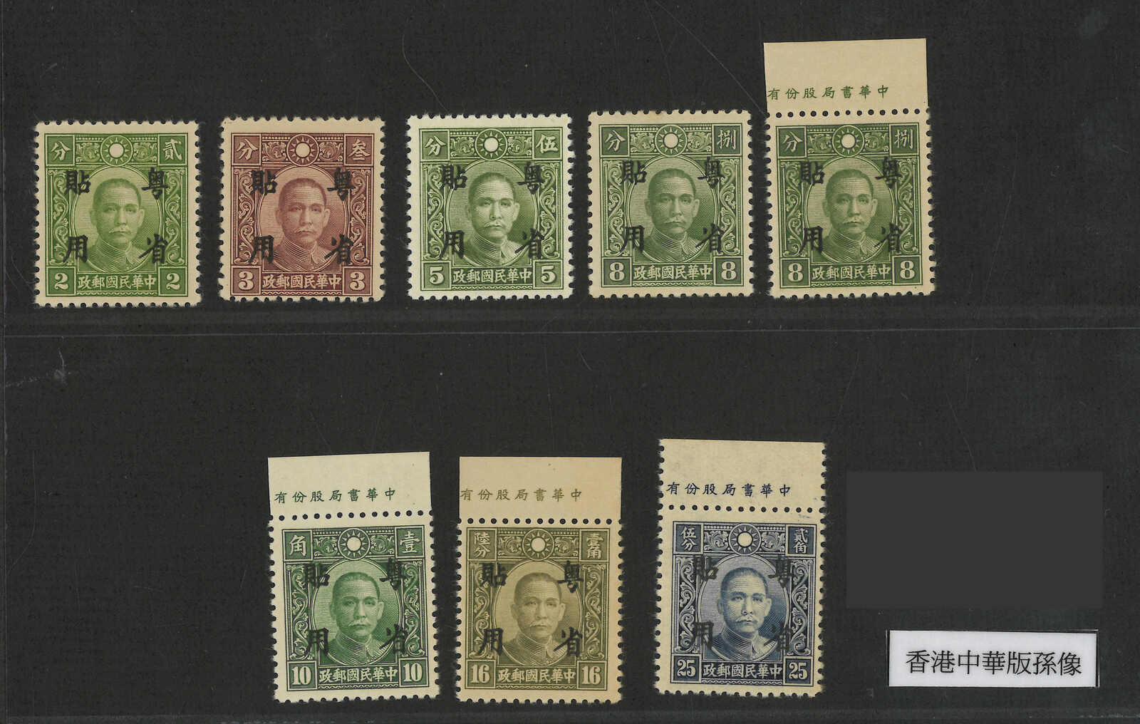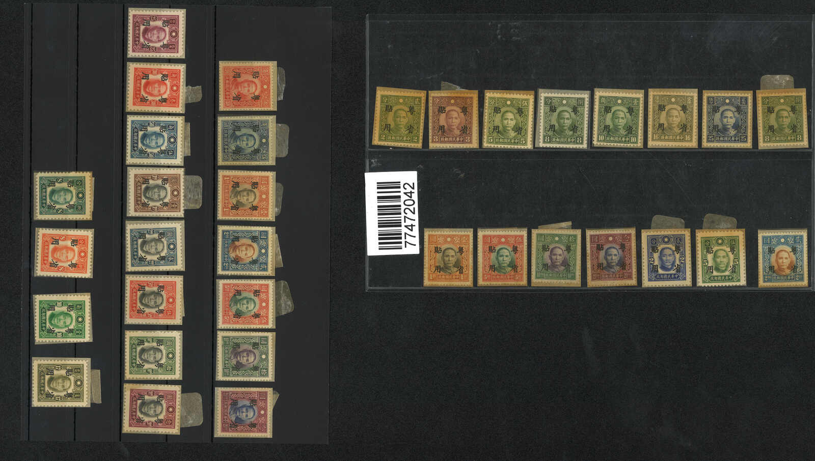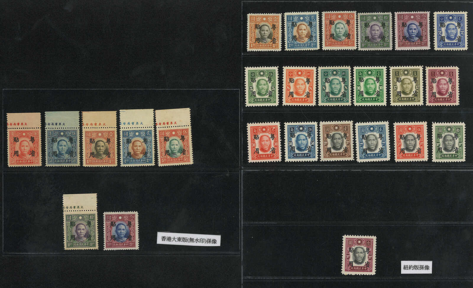 1942年一組約33枚孫像加蓋“粵省貼用”票,均為新,原票版別不同。(Image 1) (Image 2)
