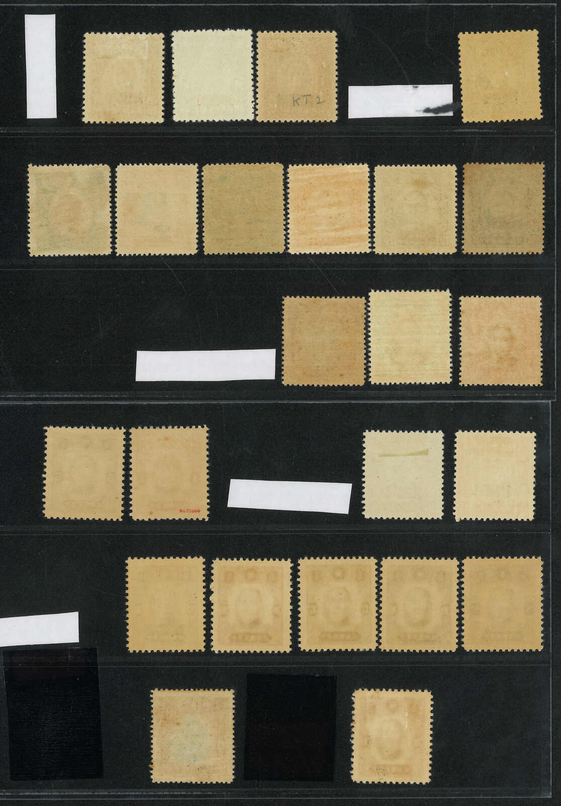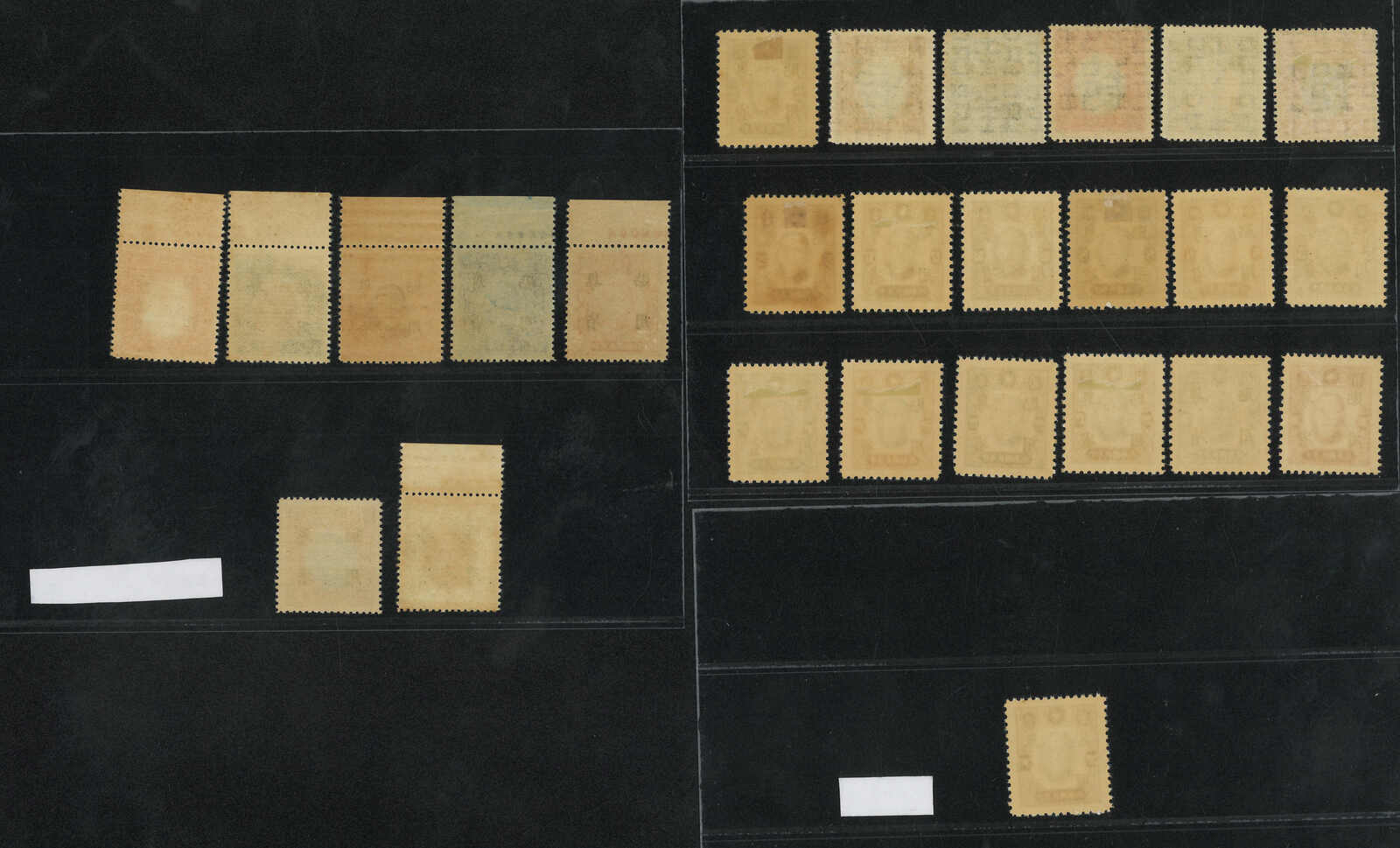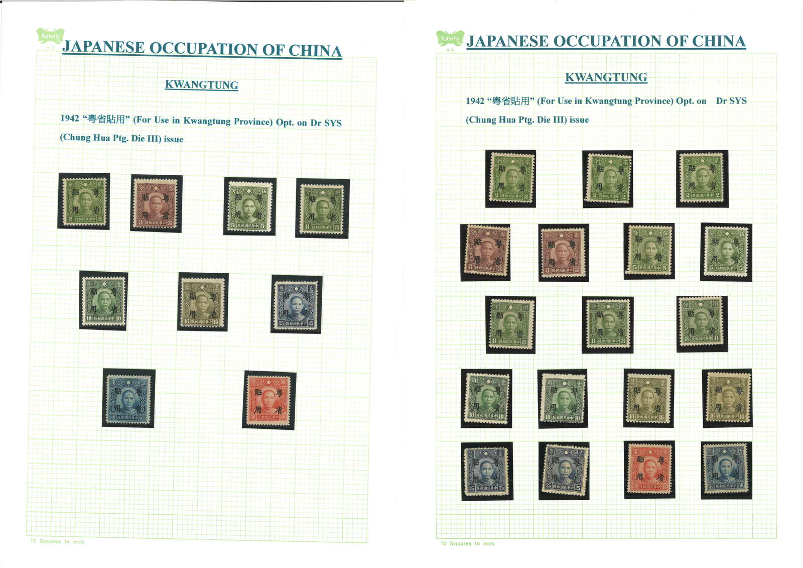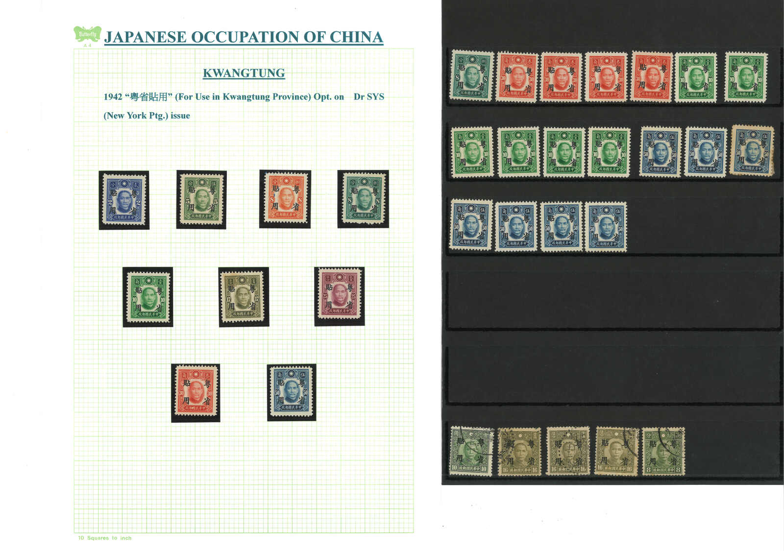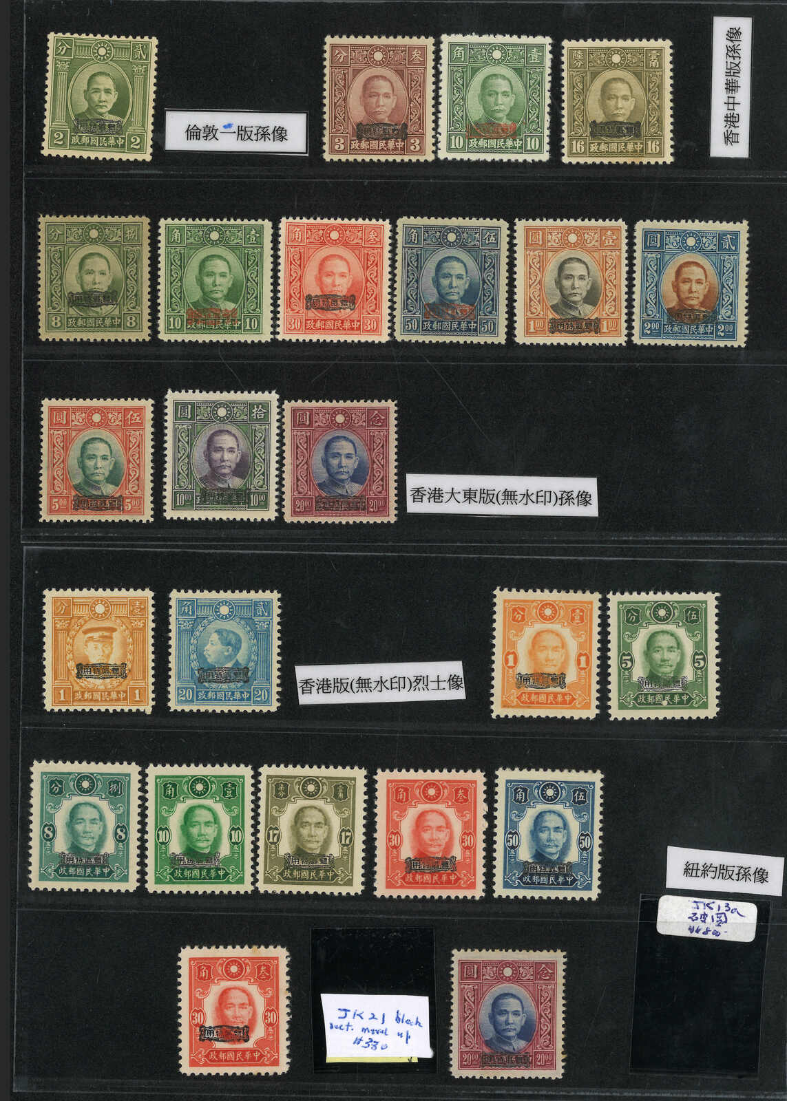 1942年一組約33枚孫像加蓋“粵省貼用”票,均為新,原票版別不同。(Image 1) (Image 2)