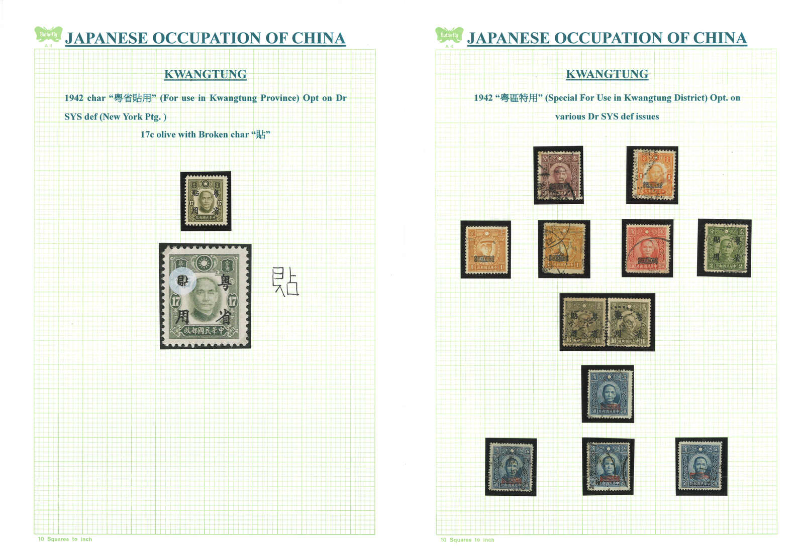 2497 image1942 Japanese occupied Kwangtung SYS ovpt. “Special For Use in Kwangtung District” complete set (Chan JK1-22), plus Dah Tung Print $20 with broken Yuan variety and New York Print 30c with overprint shifted variety. MNH/MLH with original gum.