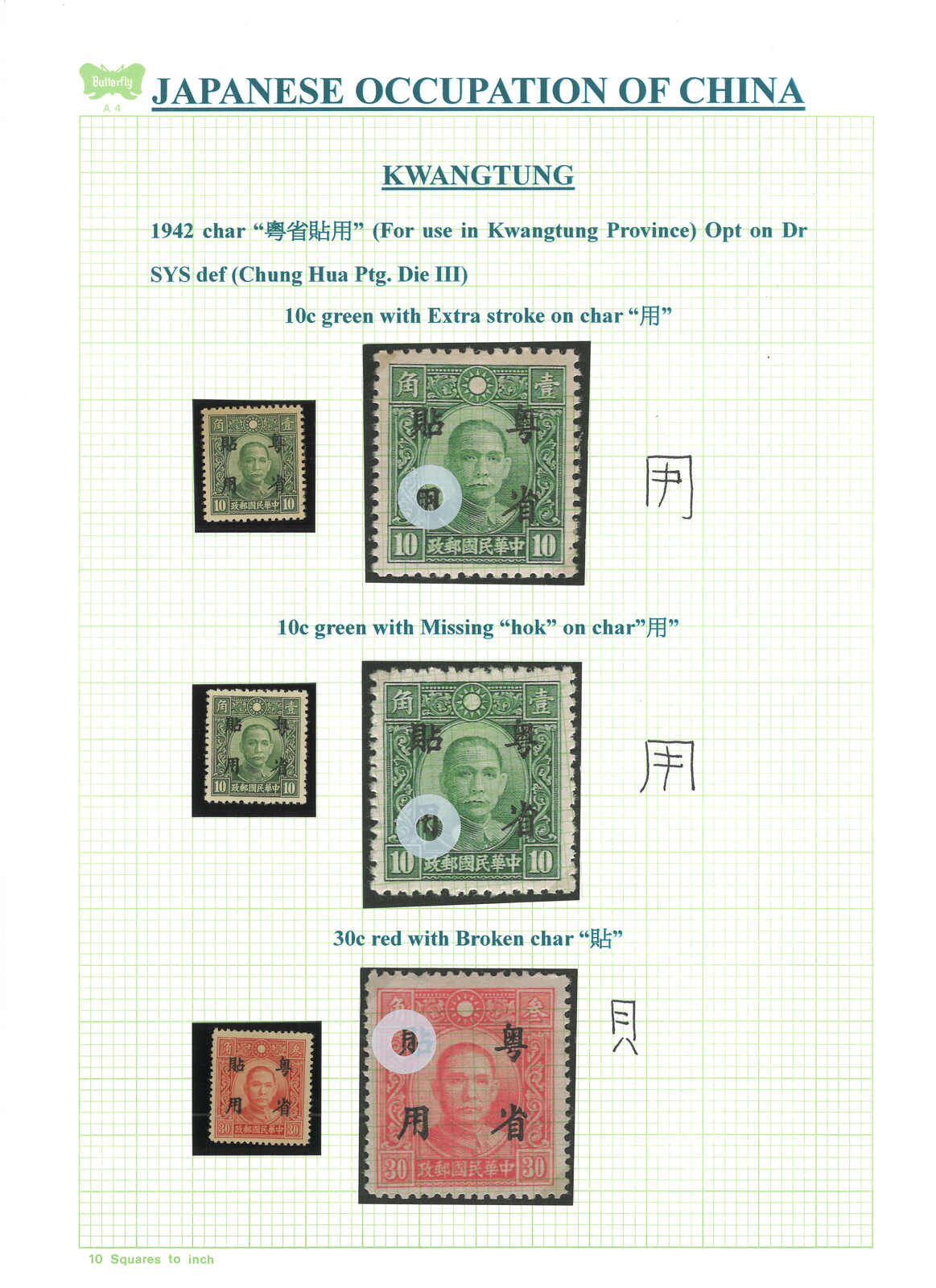 1942年日佔廣東孫像加蓋“粵區特用”新全(陳目JK1-22),另包含大東版20元帶破“圓”變異及紐約版3角帶加蓋移位變異。原膠無貼/輕貼。(Image 1) (Image 2)