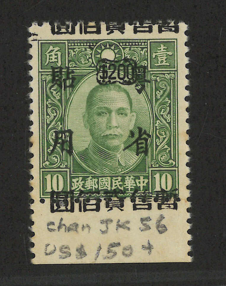 1945年日佔廣東改值“暫售貳佰圓”於孫像加蓋“粵省貼用”1角新,帶加蓋下移至下紙邊變異(陳目JK56),無貼上品。難得。(Image 1) (Image 2)