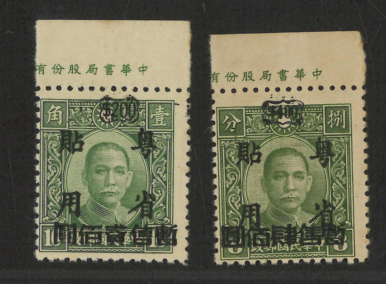 2504 image1945 Japanese occupied Kwangtung surch “Temporarily Sold” complete set, with top imprint margin (Chan JK56-57). MNH. Very Fine. Scarce.