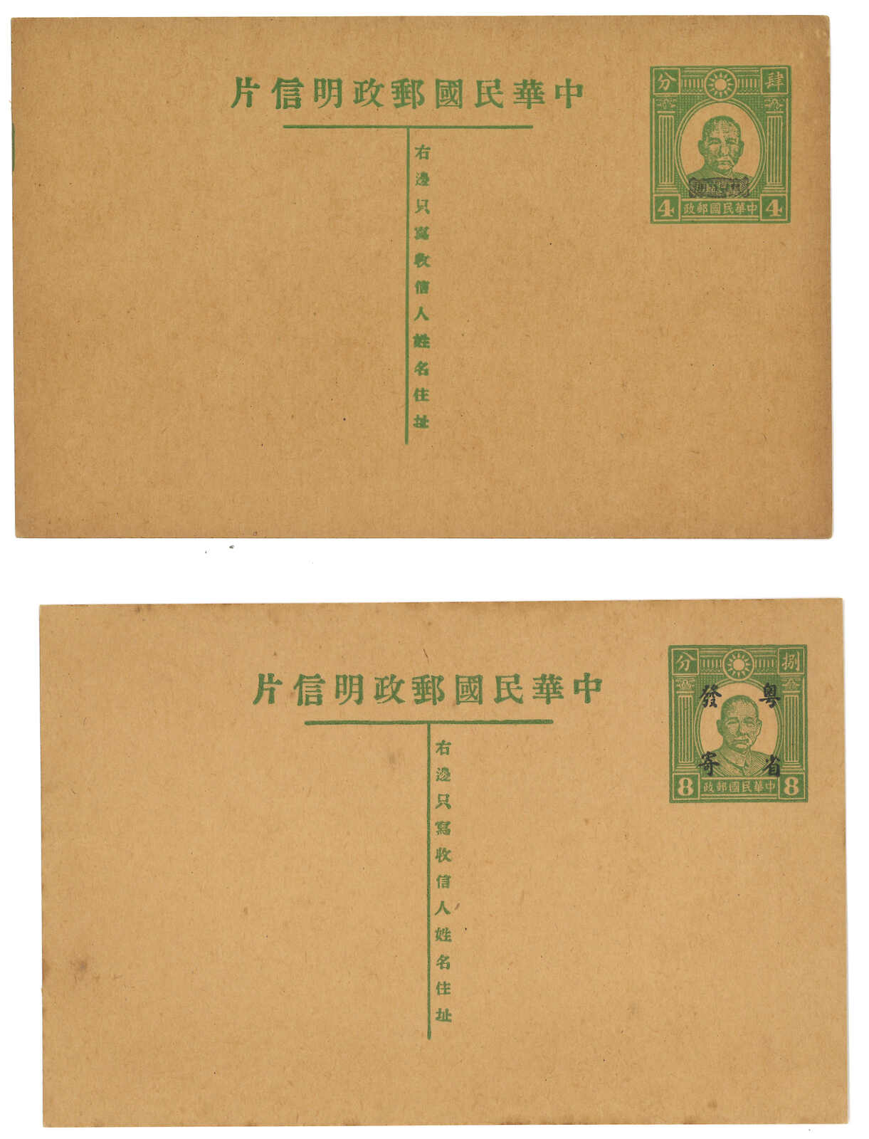 2505 image1942 a pair of Chunghwa Post SYS ovpt. “Special Use in Kwangtung” and “Sent from Kwangtung” 4c and 8c stationery cards. Both unused.