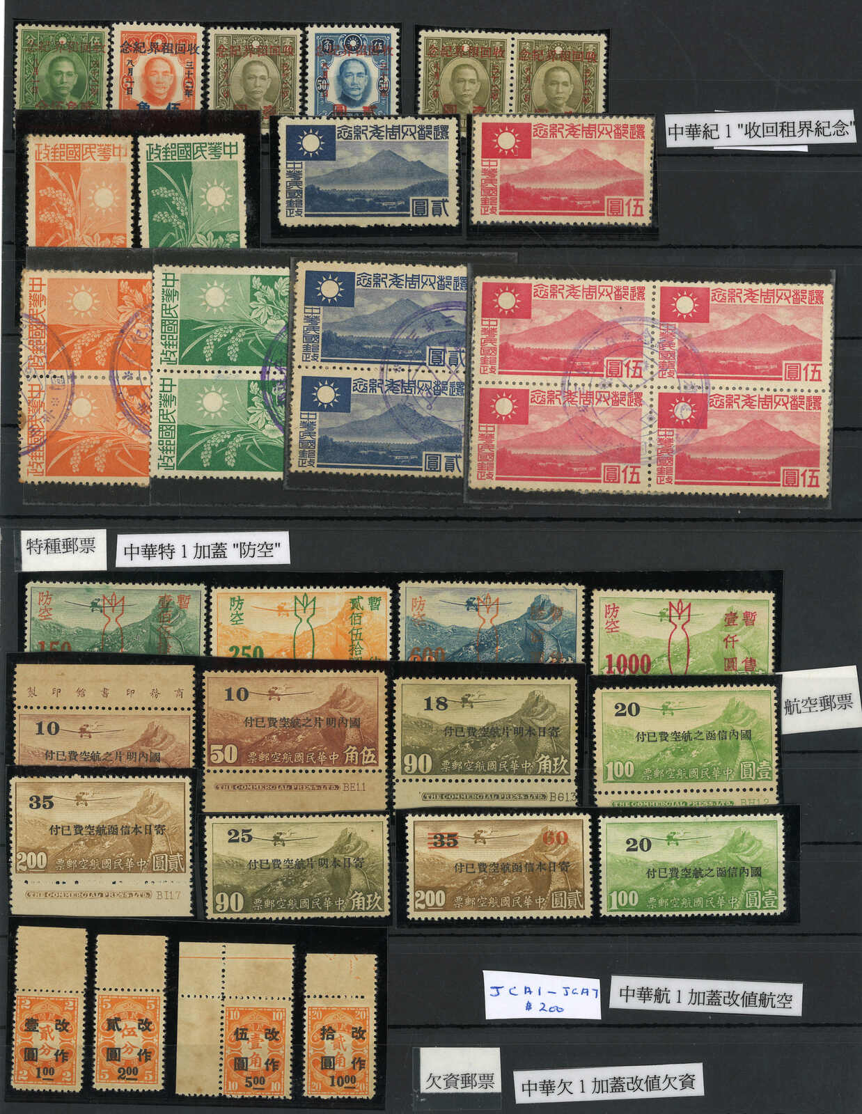 1940年代一組日佔華中紀念、航空及欠資票,包括收回上海租界、還都四週年新全及蓋銷全、防空加蓋票、加蓋日圓面值航空票及改值欠資票。上品。(Image 1) (All Images)