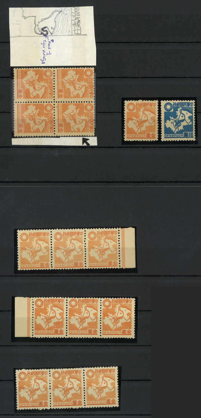 1944年一組日佔華中收回上海租界週年紀念票(陳目JC104-105),包括一套新全及四件展示不同變異之連票,包括多半島、“叄”字上破版等,有趣。(Image 1) (All Images)