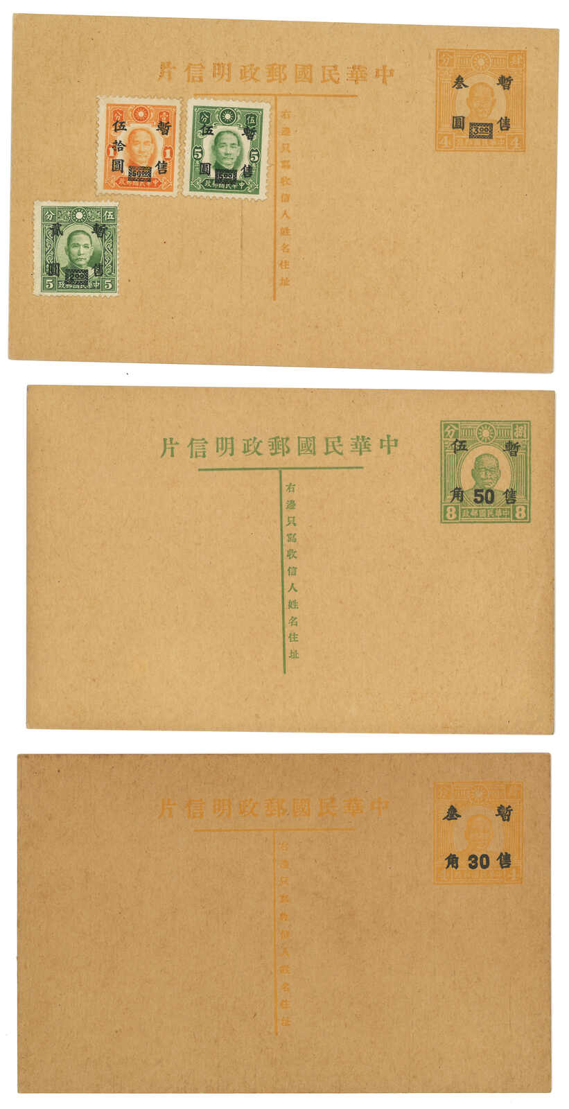 1940年代一組三件日佔華中孫像加蓋“暫售”郵資片,包括3角蓋4分、5角蓋8分及3元蓋4分,均未使用,上品。(Image 1) (All Images)