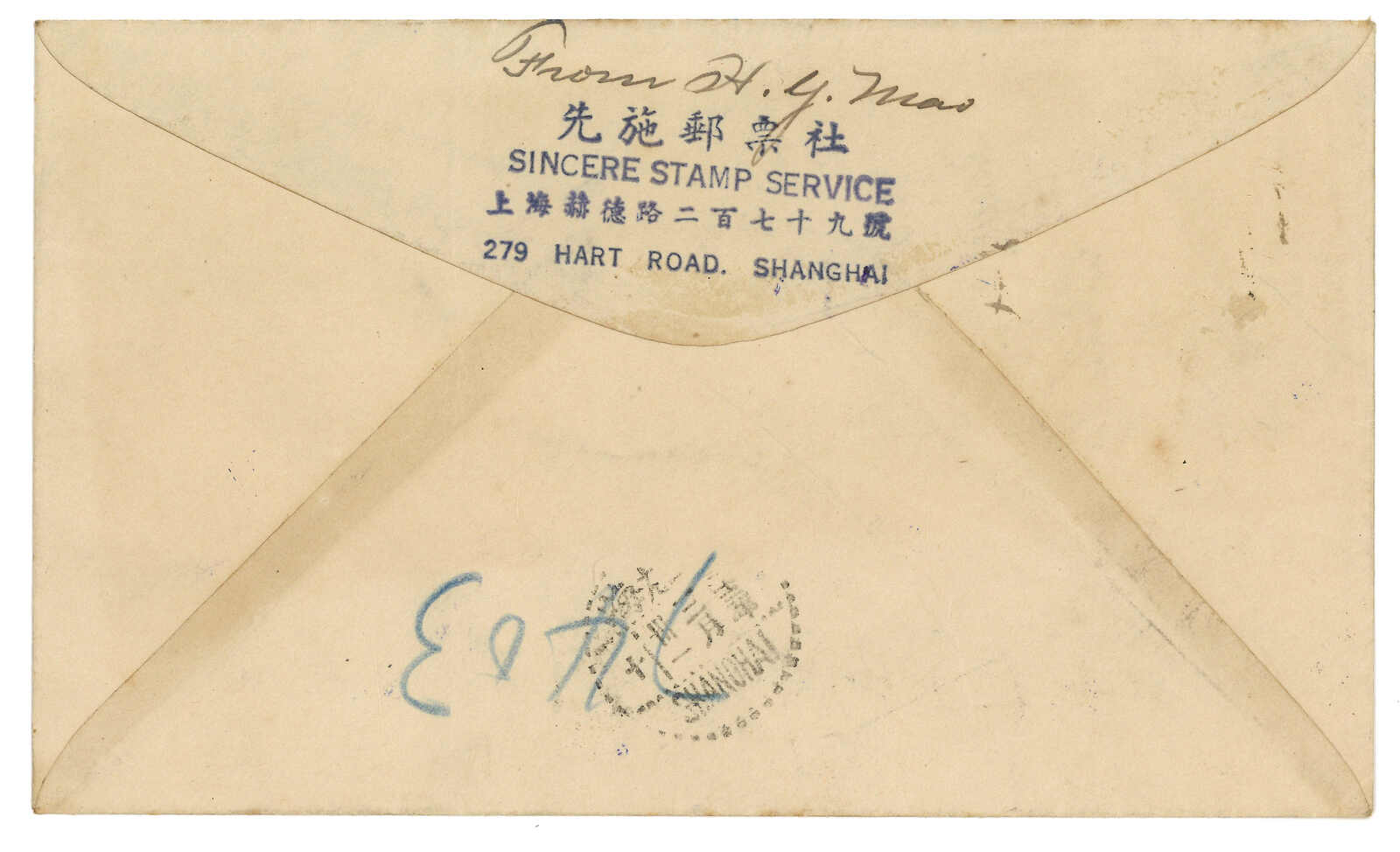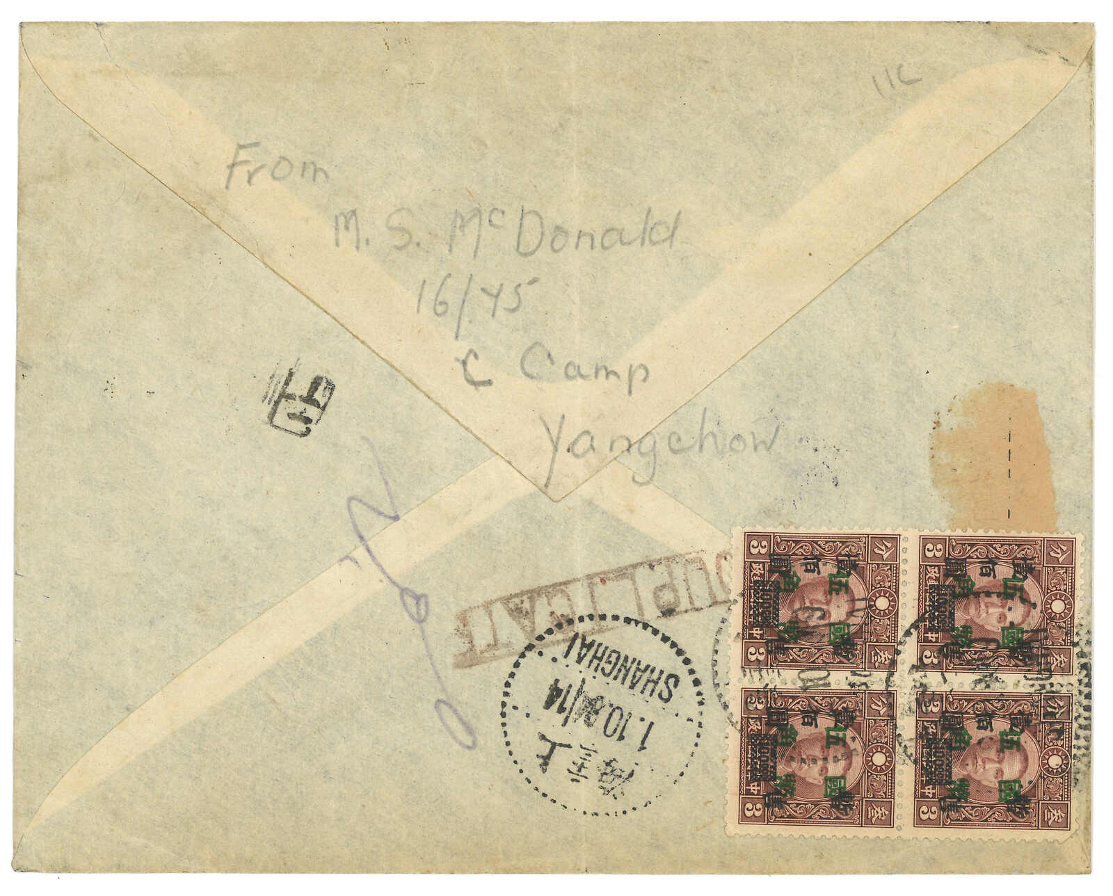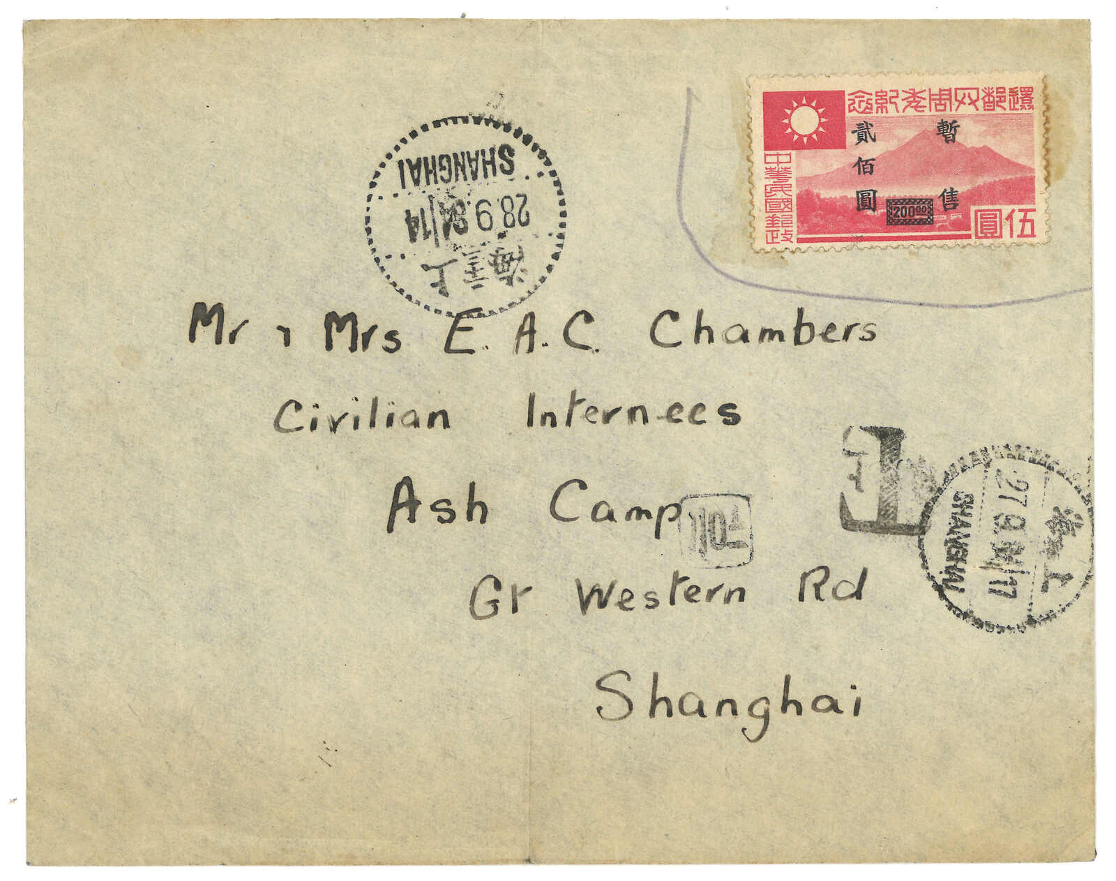 1945.9.24 滬西第二集中營寄蘇格蘭,鈐美國陸軍軍郵局日戳及帶框“Internee mail free of postage / Shanghai PO”免資指示戳。此信寄出時二戰已結束。(Image 1) (Image 2)