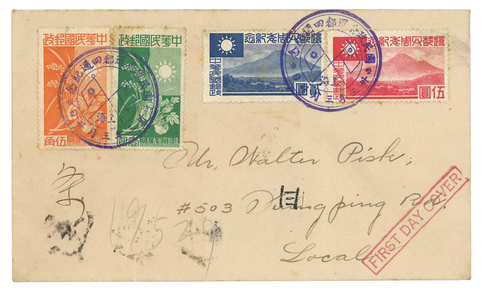 1944.3.30 日佔華中還都四週年紀念票首日封(陳目JC100-103),銷紀念日戳,寄南京本埠。(Image 1) (Image 2)