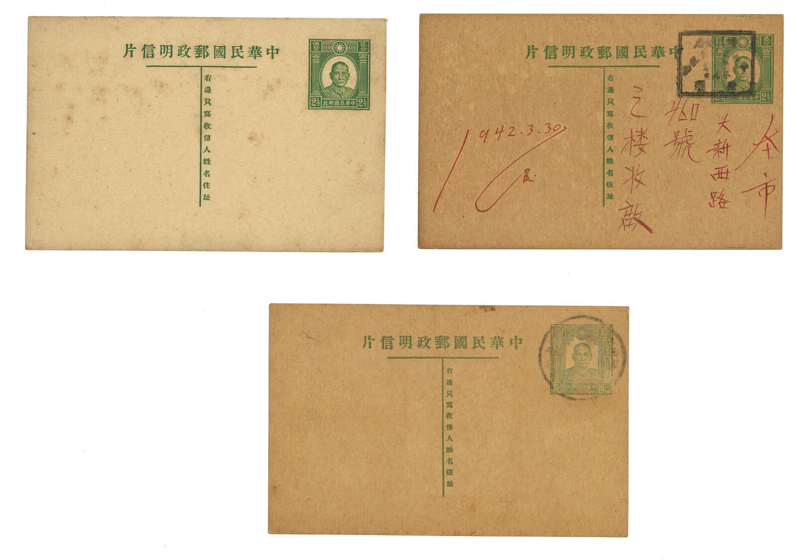 1942.3.30 孫像2分5厘郵資片,銷“國民政府 / 還都二週年紀念 / 廣州”紀念方戳,寄廣州本埠。另附兩件2分5厘及10元片。(Image 1) (Image 2)