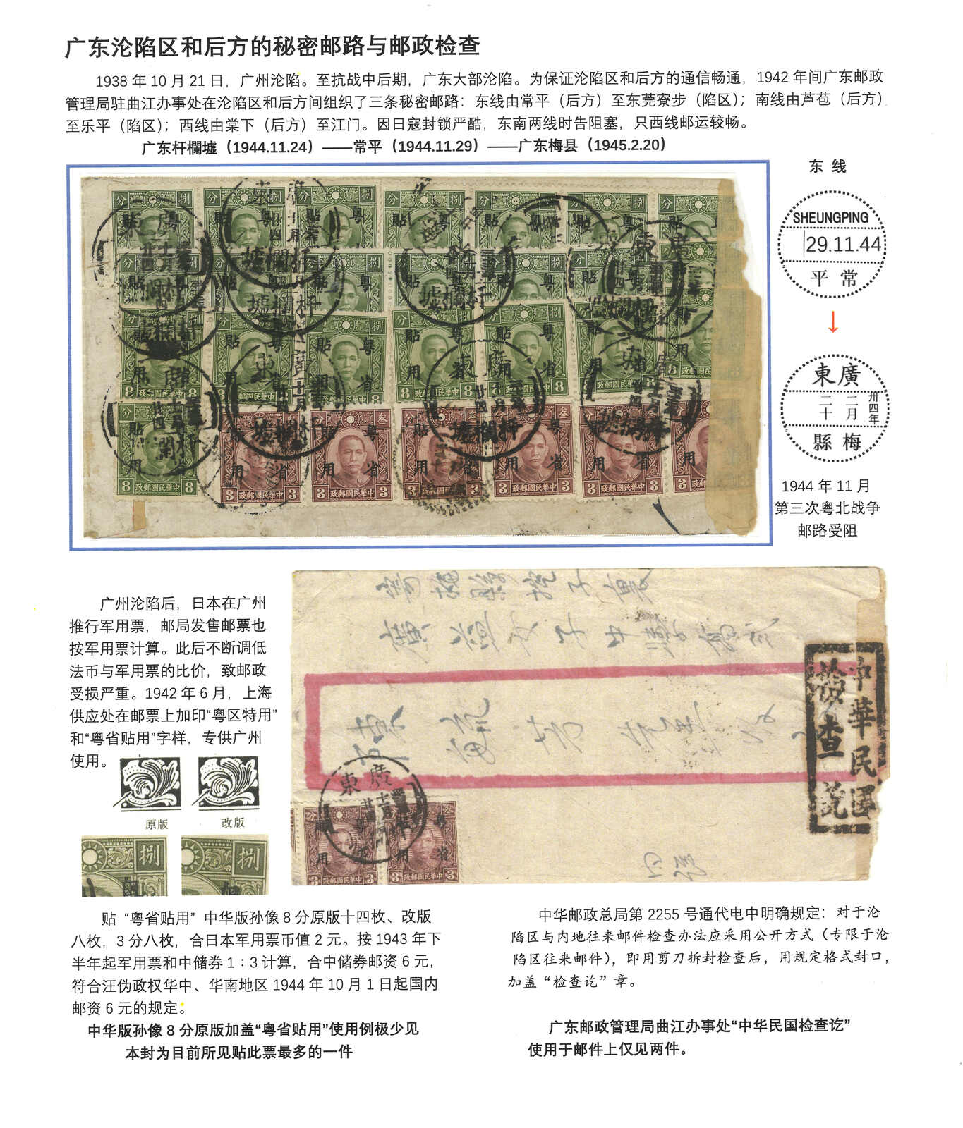 1944.11.24 桿欄墟經秘密郵路寄梅縣。中式封,正背貼孫像加蓋粵省貼用共30枚,合日本軍票2元 / 中儲券6元,合汪偽政權華南國內郵資,銷廣東杆欄墟腰框日戳。11.29經常平。2.20抵梅縣。用時近三個月。正面鈐“中華民國檢查訖”。為中華版實心全鈕孫像8分原票加蓋粵省貼用(陳目JK26)之稀罕實寄例子,更遑論多枚連票。 自廣東淪陷後,組織了三條秘密郵路(東、南及西線)。常平為東線,但時告阻塞。(Image 1) (All Images)