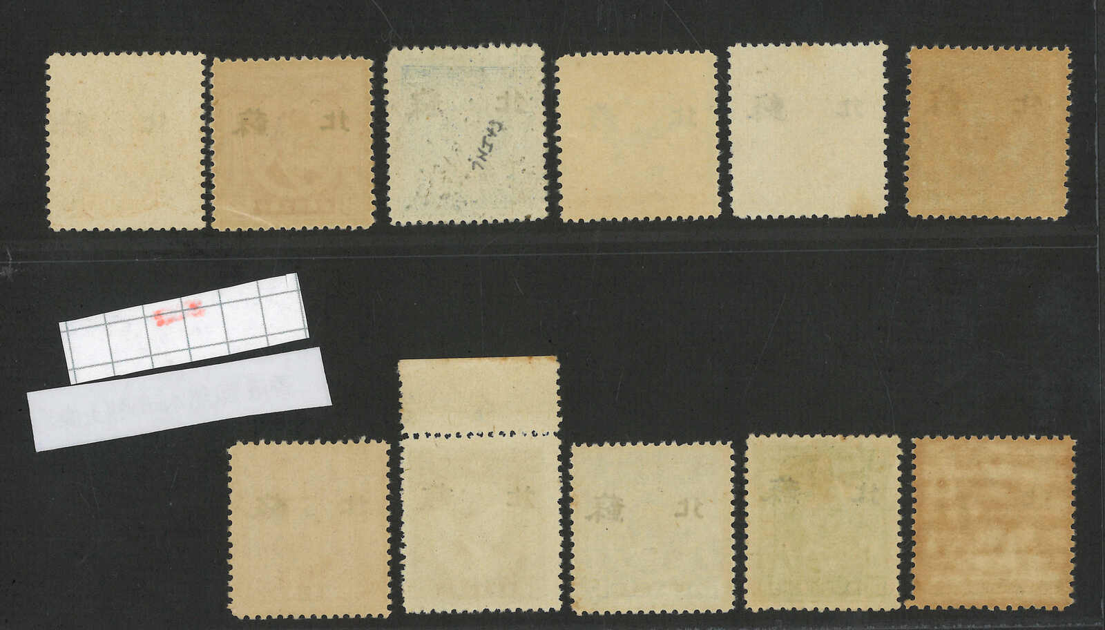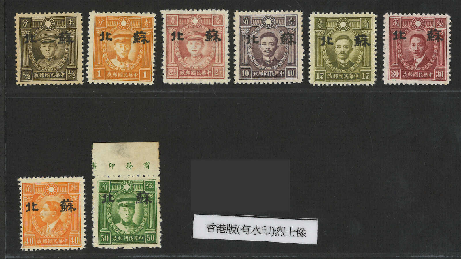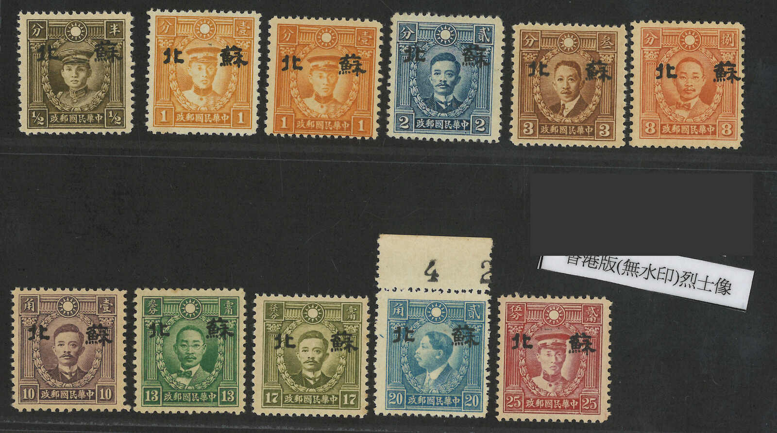 1941年日佔華北加蓋小字“蘇北”,蓋於大東版有水印及北京版烈士新全(陳目JN163-167),背貼,背微黃。(Image 1)