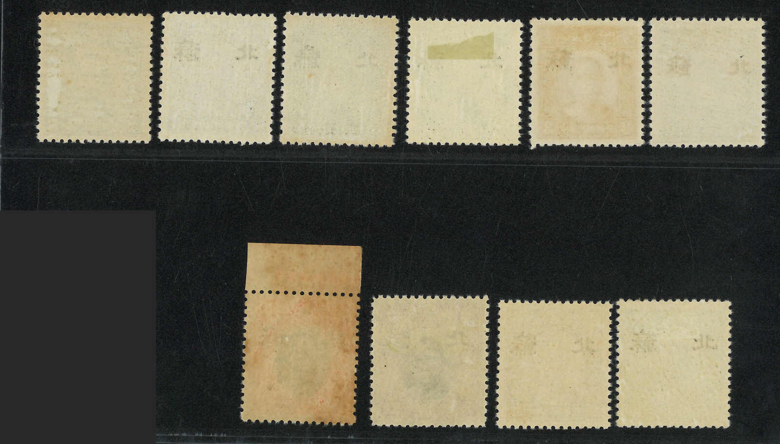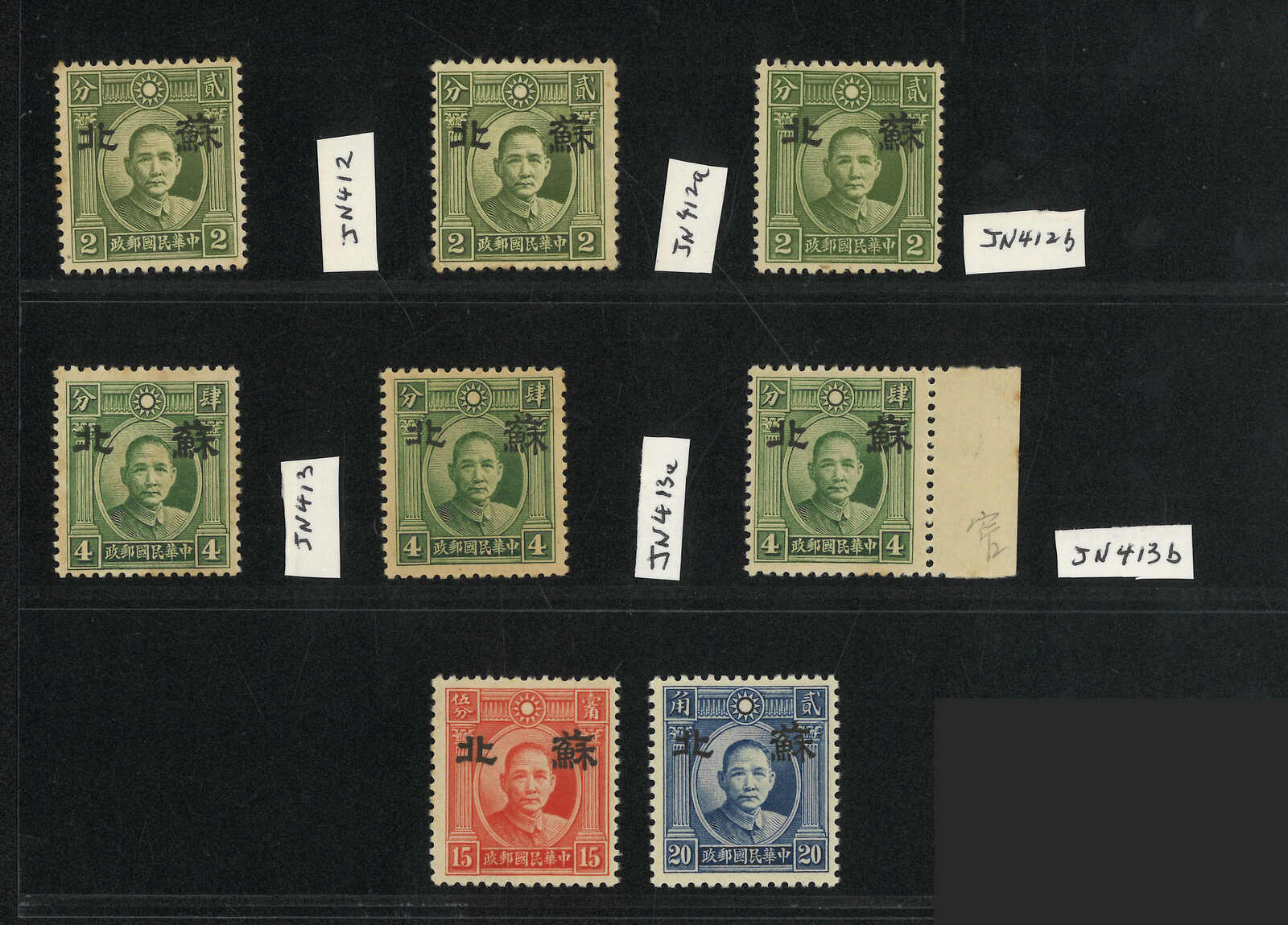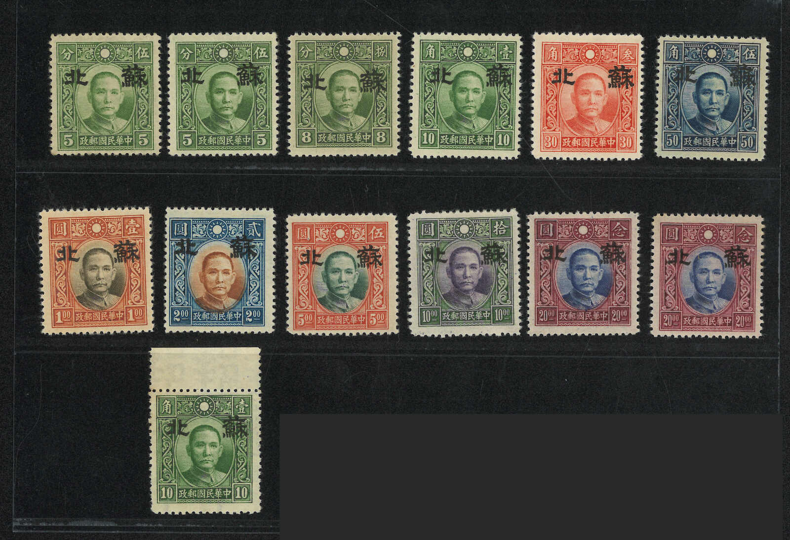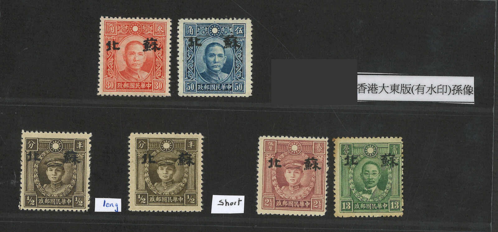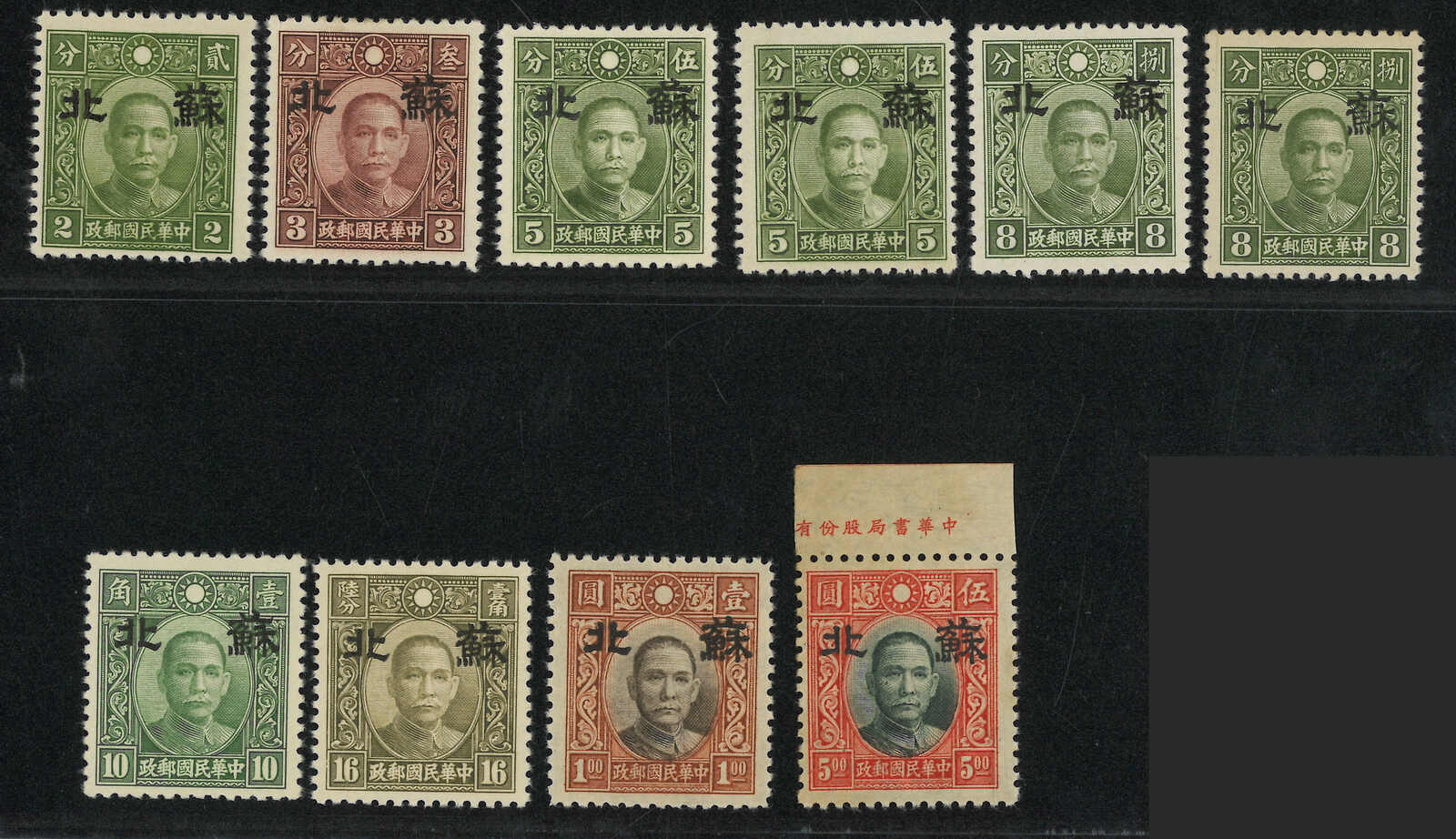 1941年大東版無水印及有水印孫像加蓋大字“蘇北”新全(陳目JN424-434),原膠背貼。(Image 1)
