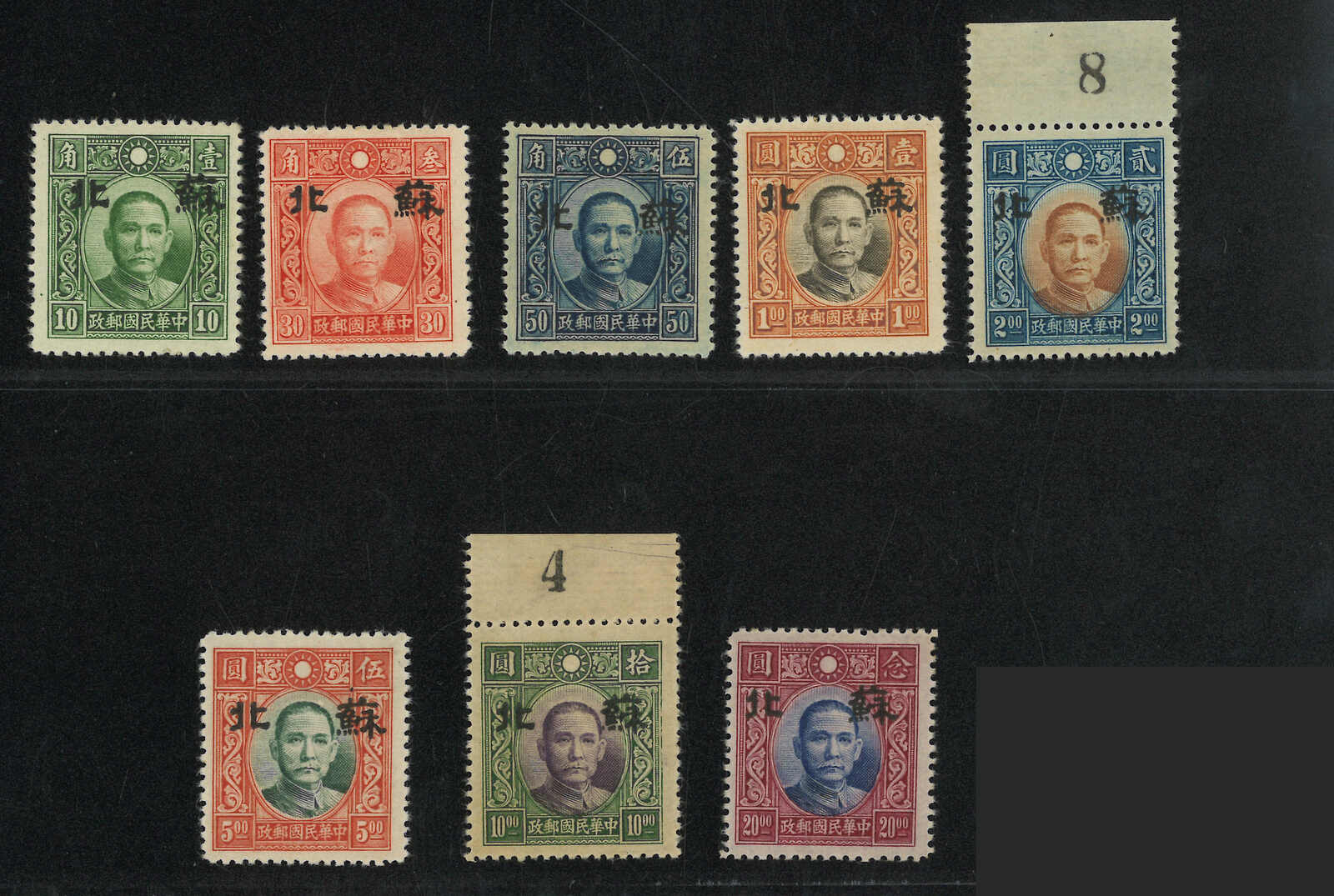1941年中華版(實心全鈕)孫像加蓋大字“蘇北”新全(陳目JN416-423),無貼/背貼上品。(Image 1)