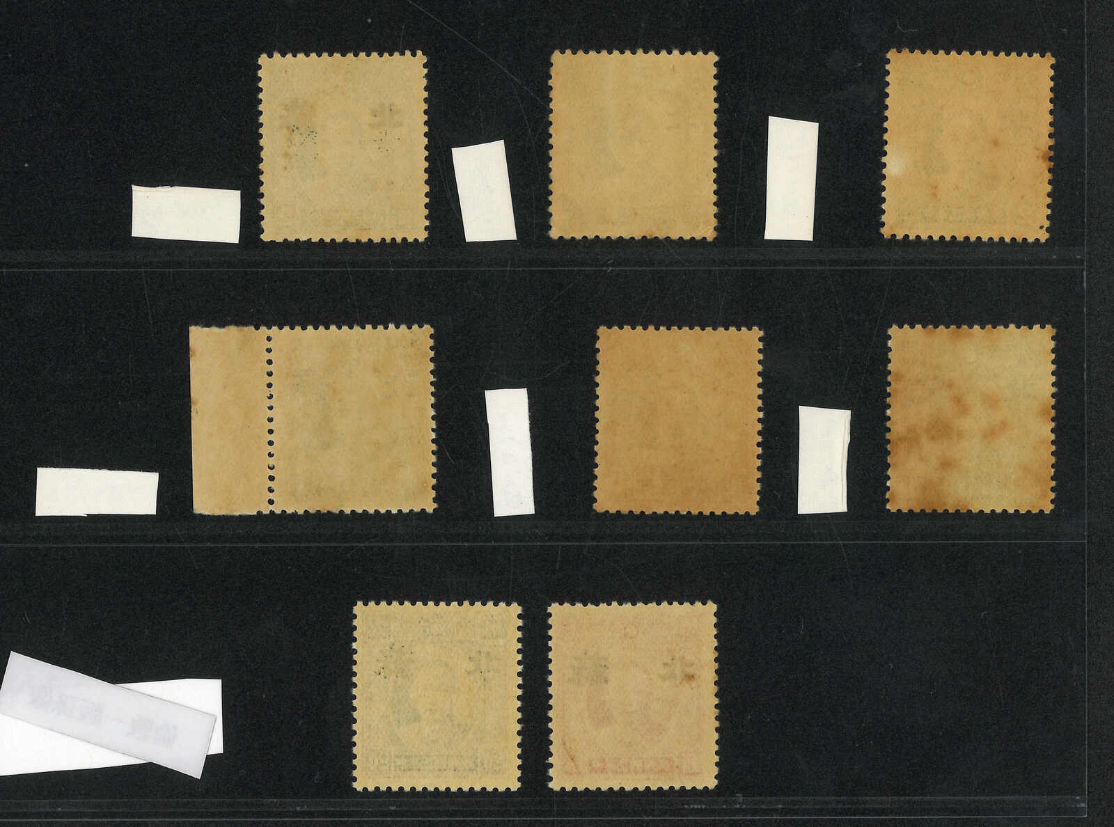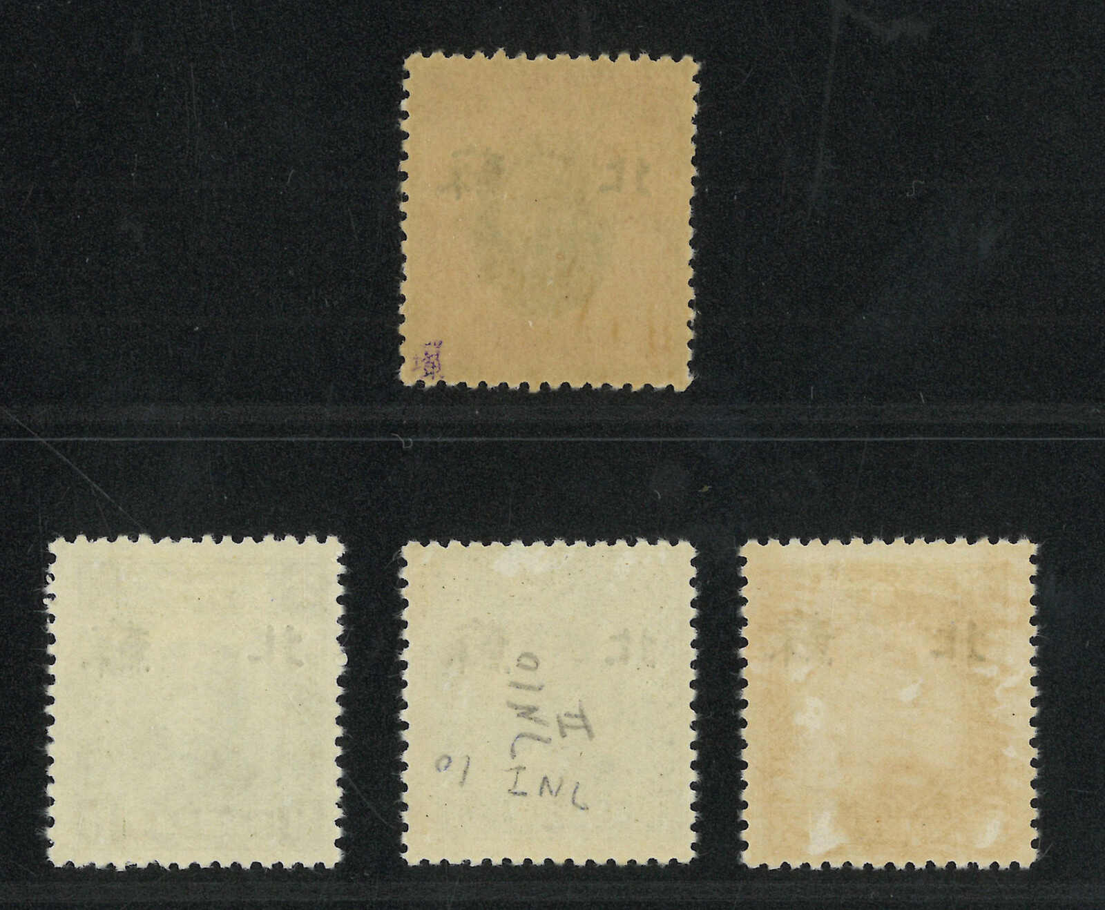 1941 London Print SYS ovpt. large figure “Supeh” complete set (Chan JN412-415), showcasing original stamps in different settings. MNH with original gum. Several with toning spots on reverse.