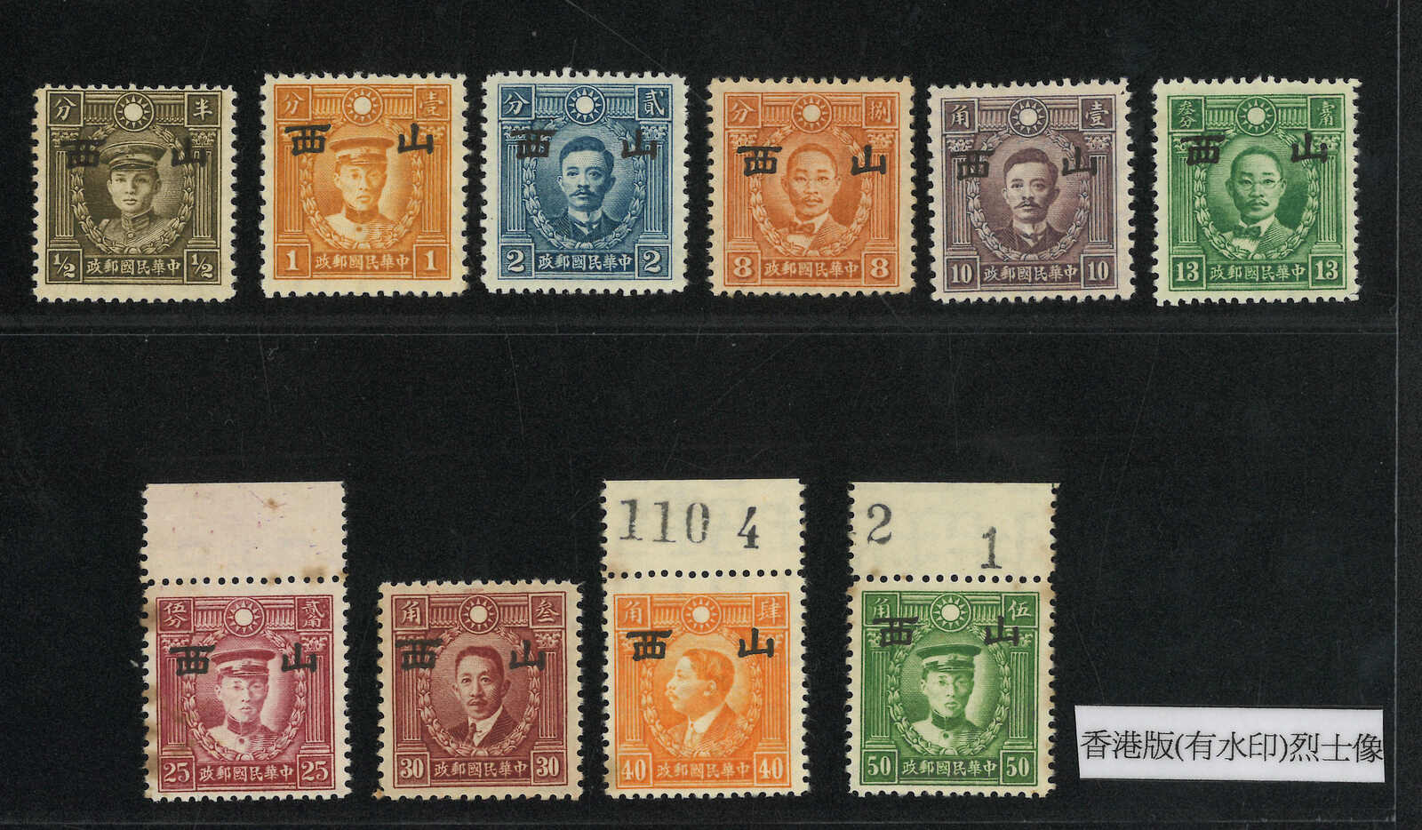 1941年香港版有水印烈士加蓋大字“山西”新全(陳目JN402-411),無貼,數枚背微黃點。(Image 1)