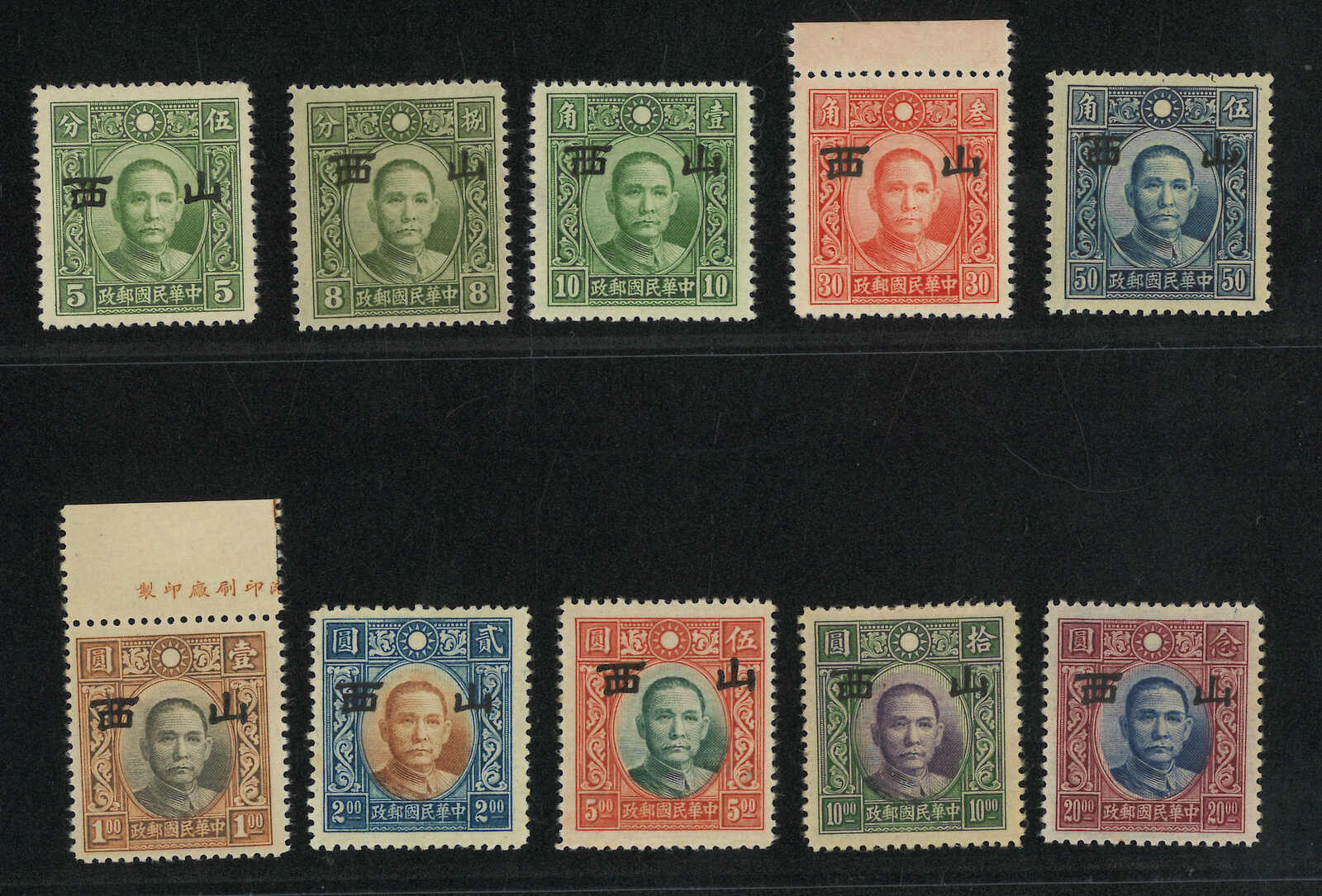 1941年大東版無水印孫像加蓋大字“山西”新全(陳目JN370-379),原膠無貼/背貼。(Image 1)