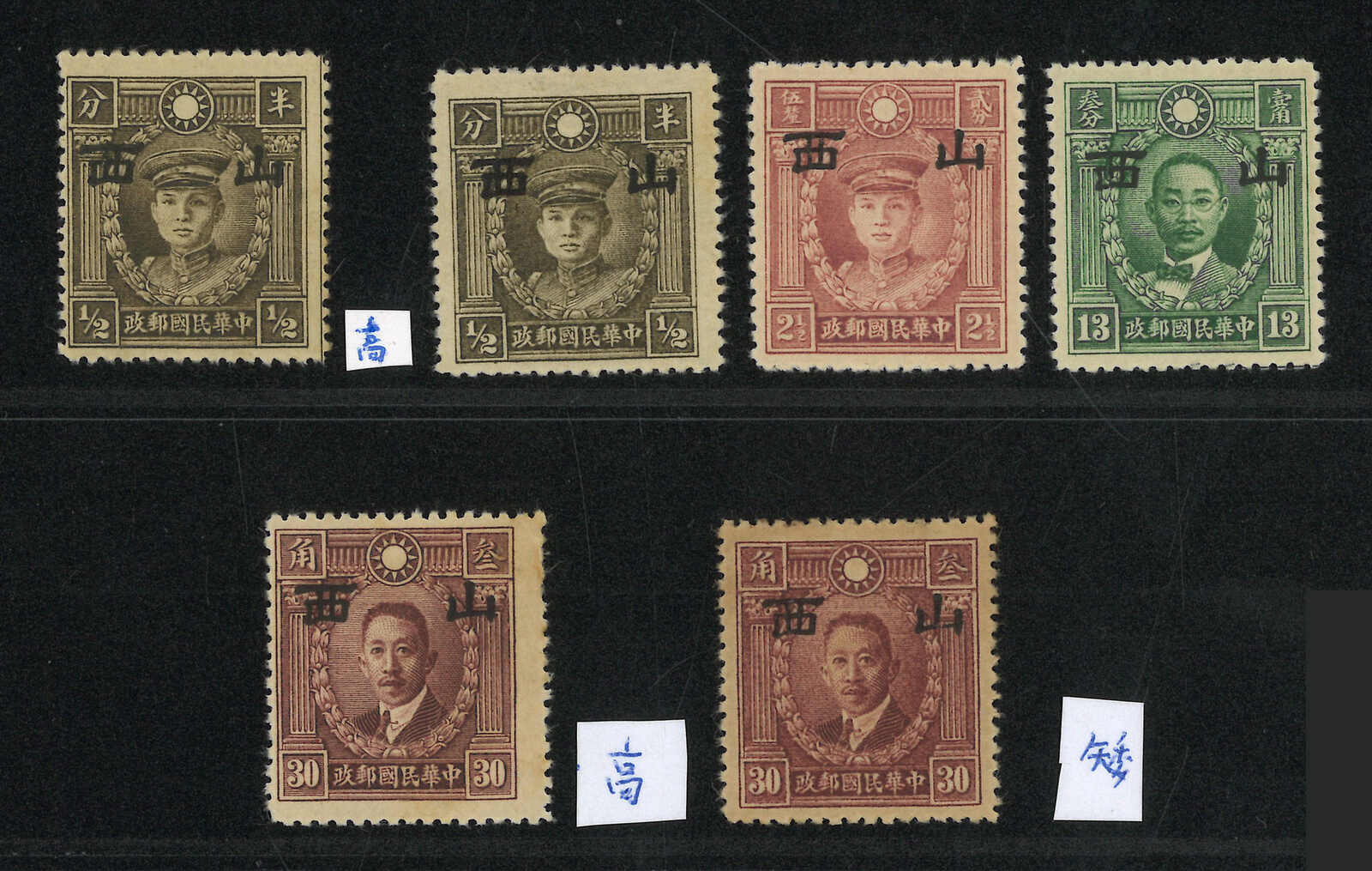 1941年一組約92枚孫像及烈士加蓋小字及大字“山西”票,包含新舊票,原票版別不同。(Image 1)