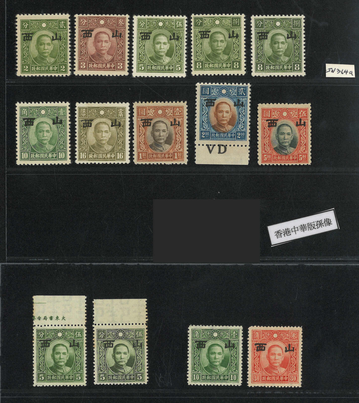 1941年中華版(實心全鈕)及大東版有水印孫像加蓋大字“山西”新全(陳目JN361-369、380-382),背貼上品。(Image 1)