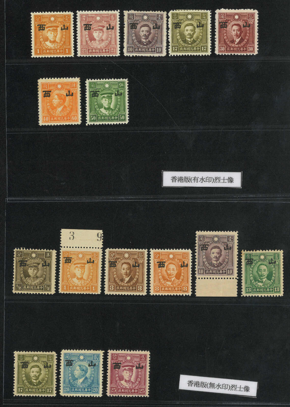 1941年香港版無水印及有水印烈士加蓋小字“山西”新全(陳目JN131-141),原膠無貼/背貼。(Image 1)