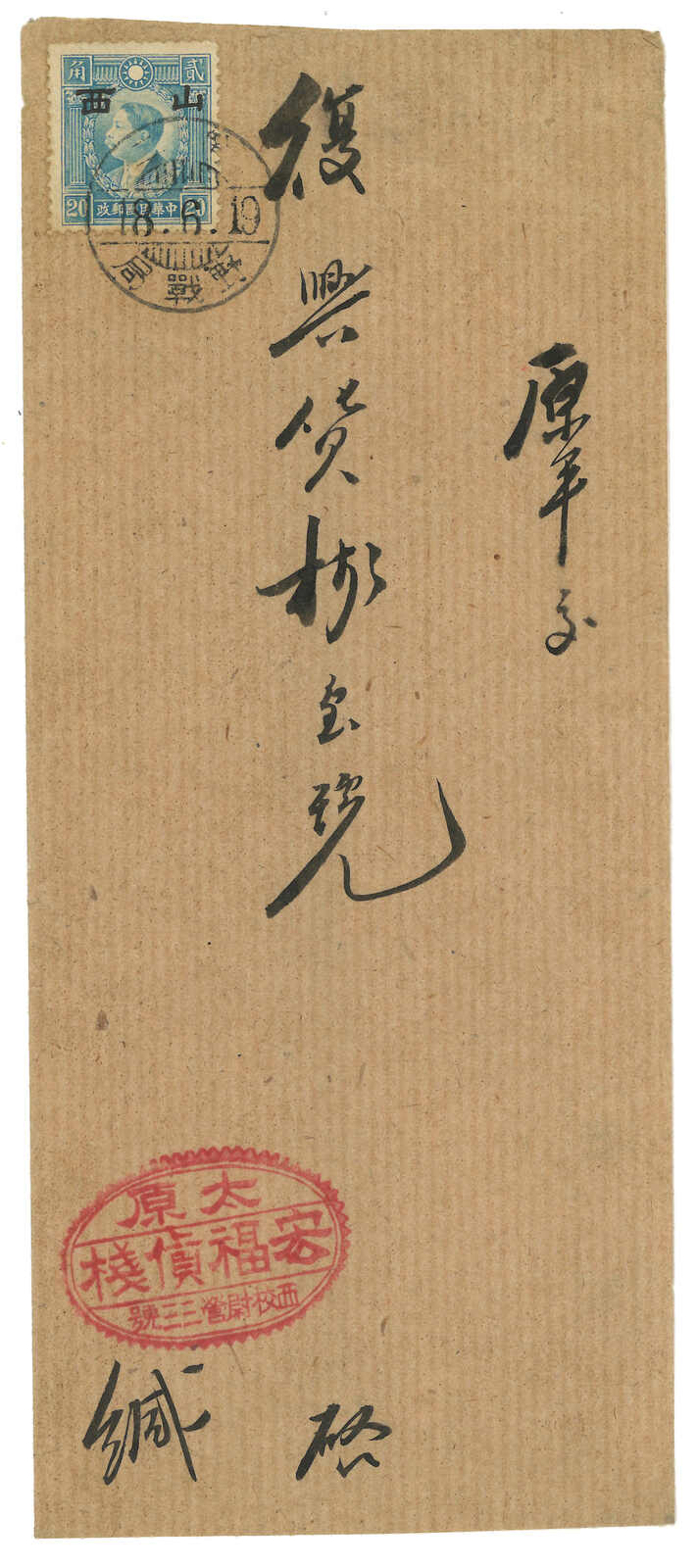 太原本埠軍郵封,貼香港版烈士加蓋大字山西2角,銷第二野戰軍郵局日戳,旁鈐橢圓形太原商號戳記。(Image 1)